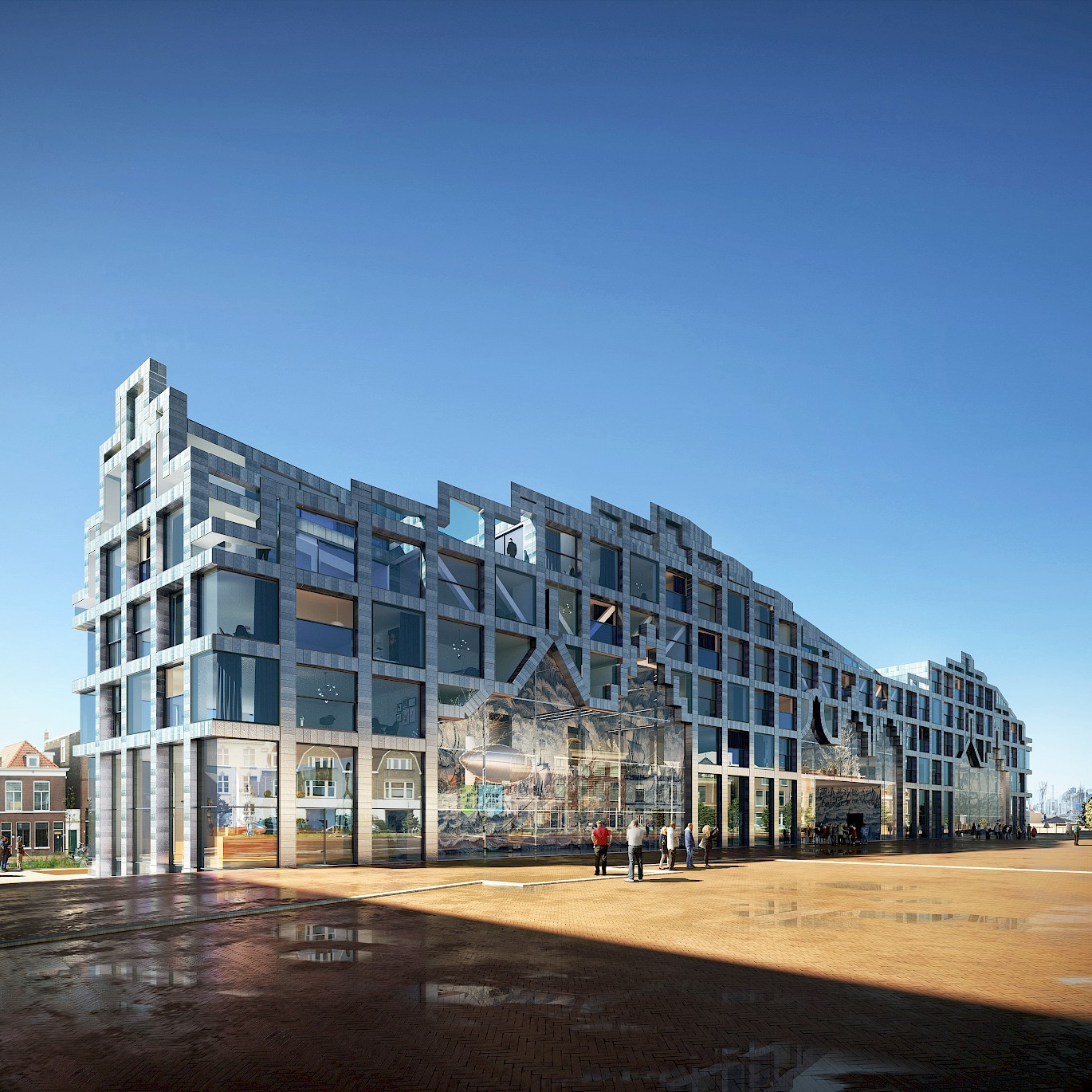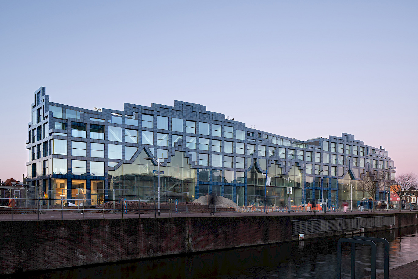 The three tall facades at the head of the complex refer to houses connected to Delft history: the Oost-Indisch Huis (East-Indies House) as a reference to pioneer Jan Joost van Lodesteyn, the birthplace of Hugo de Groot, and the residence of the maritime hero Piet Hein. The seven glass facades on the centre side form a trilogy. On the left, the facade profiles of the medical pioneers: the home of Antoni van Leeuwenhoek and the Anatomisch Theather (Anatomical Theatre) where Reinier de Graaf, among others, did his experiments. In the middle, three facade profiles that refer to craft and arts: The Vergulde Bijbel (Gilded Bible, a reference to the first printed Dutch-language book), the house in the painting "Het Straatje van Vermeer" (The Little Street of Vermeer), and the first shop of the Porceleyne Fles on the Markt. And on the right, the facade profiles of Holland's and Delft's founders: the former Sint Agatha monastery where the Prince of Orange lived and the Klooster Koningsveld (Koningsveld Monastery) built by noblewoman Ricardis, the founder of Delft, in 1271.
