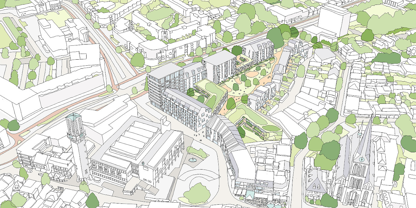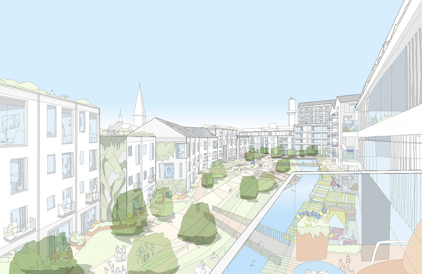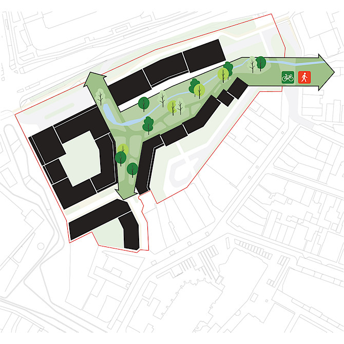 Verbinden is het maximaal doorwaadbaar maken van het gebied en het realiseren van goede aansluitingen op de directe omgeving in alle richtingen. Een belangrijke verbindende rol is er natuurlijk voor het landschap van de Drienerbeek met de routes voor langzaam verkeer met bijbehorende verblijfsplekken. Maar er wordt eveneens aan de zuidzijde aangesloten op het winkelachtje van de compacte binnenstad met passende programmatische invulling in de plinten.