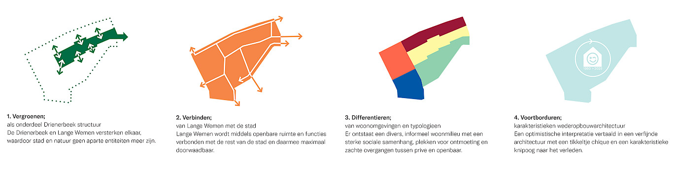 De visie wordt gekenmerkt door vier thema’s te weten: vergroenen, verbinden, differentiëren en voortborduren. Vergroenen betekent dat er wordt voorzien in een aangenaam, groene woonomgeving met ontmoetingsplekken en speelveldjes waar buurtbewoners doorheen lopen en fietsen. En elkaar ontmoeten.