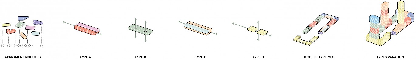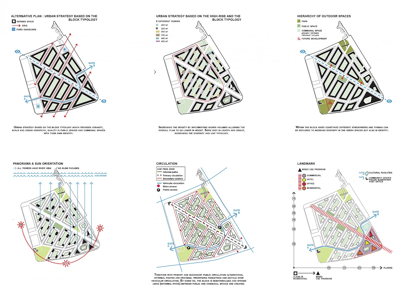 We believe that housing in Korea, and specifically the International Design Competition of Jamsil Apartment complex 5 Residential Complex Facilities, could benefit from this kind of strategy, where there is a great extra quality of life for families, kids, parents, grandparents and other residents in those courtyards. Our design proposal elaborates our attempt to adapt the block typology and the Korean high-rise typology to suit local zoning regulations, intended visual and landscape links through the site, proposed FAR, and the sustainable mandate for the project. The utilization of the block typology is a main structuring principle.