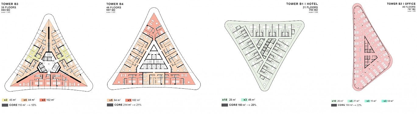 Our plot features a triangular metropolitan knot next to the highway & subway entrances with a lively & appealing shopping environment at lower levels. This complex is topped up with spectacular triangular high towers maximizing its view potential. Although a triangular tower has slightly more façade surface than a comparable rectangular tower, the benefit for each apartment is substantial: Each apartment could in this triangular lay-out be very wide and feature 22% more façade per apartment than it would in a rectangular lay-out. On this particular site this would be a great benefit with beautiful views over the river and the Lotte tower. Also by using these type of towers we were able to fit more towers on this triangular footprint and could eliminate north facing facades.