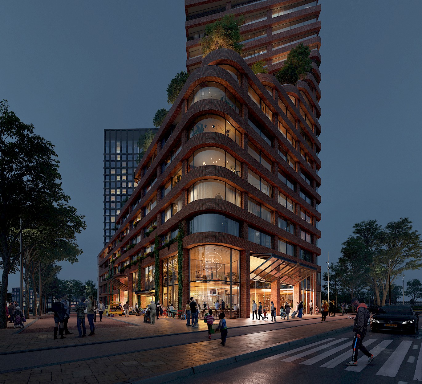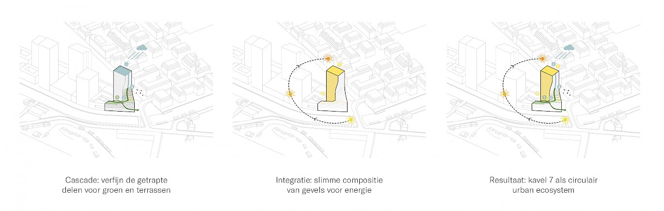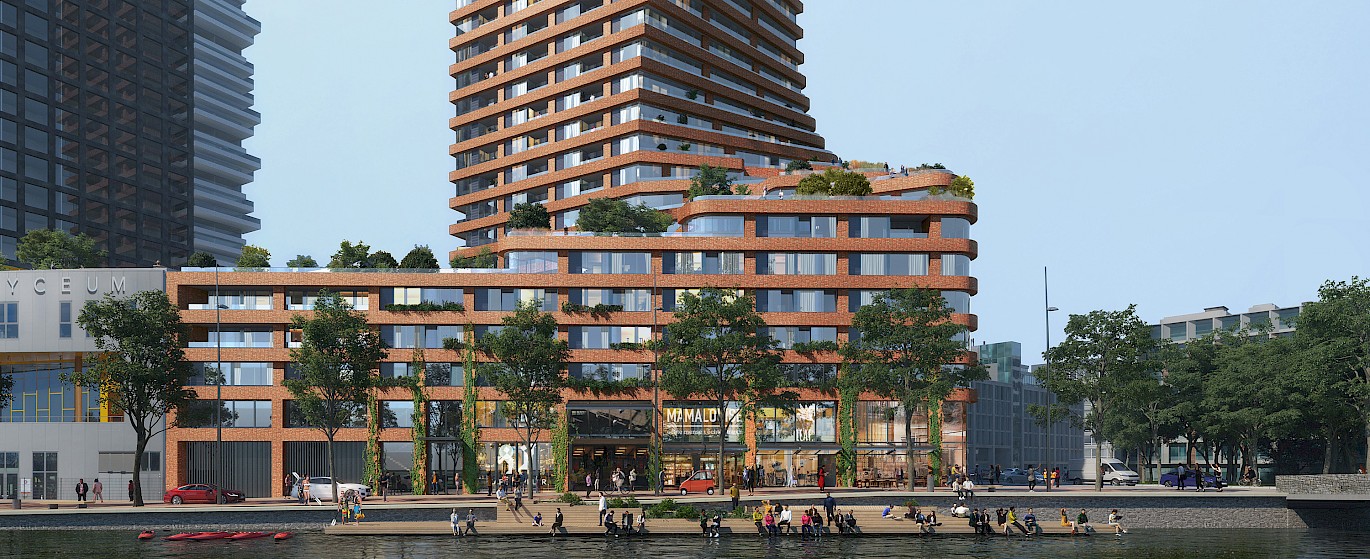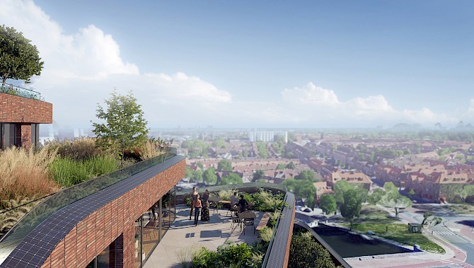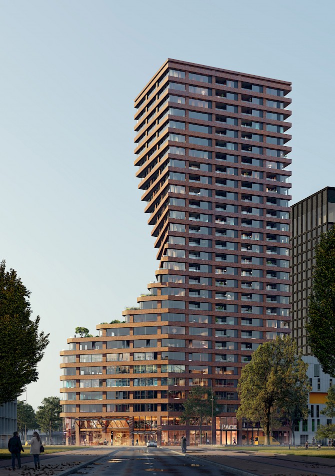 Our design searches for a new generation of high-rise buildings that connect the skyline with the street life, while introducing stepped building parts as a collective roof landscape and outdoor space for residents. Materialisation is site specific and the choice for an innovative use of traditional brick stems from the desire to create a building that has its own identity while reaching out to the surrounding environment.