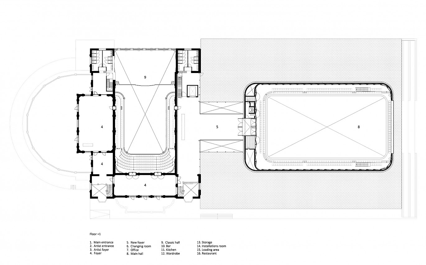 Bestaand en nieuw worden door een gemeenschappelijke plint met elkaar verbonden, waarmee het Musis Sacrum een eigentijdse, nieuwe monumentaliteit krijgt die hoort bij een muzikaal programma van dergelijk niveau.