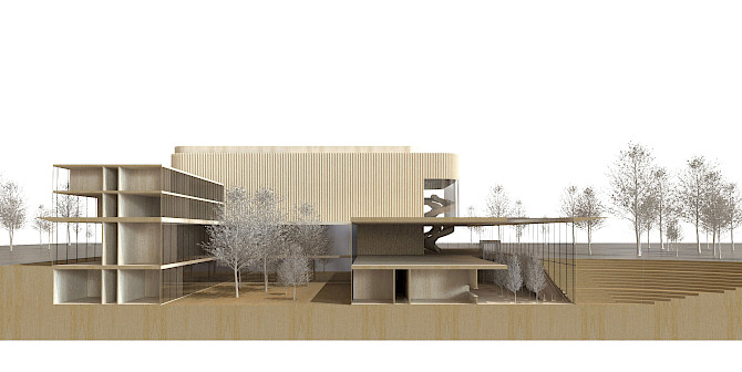 A new multifunctional hall is designed with movable floors and variable acoustics through acoustic movable panels, allowing a great diversity (orchestral performances in the existing classical hall, classical and popular 'chamber music', symphonic music and amplified music, jazz, pop and world music in the new hall and many musical performances in the amphitheatre) and a real richness of all possible musical uses. This approach goes for both existing halls.