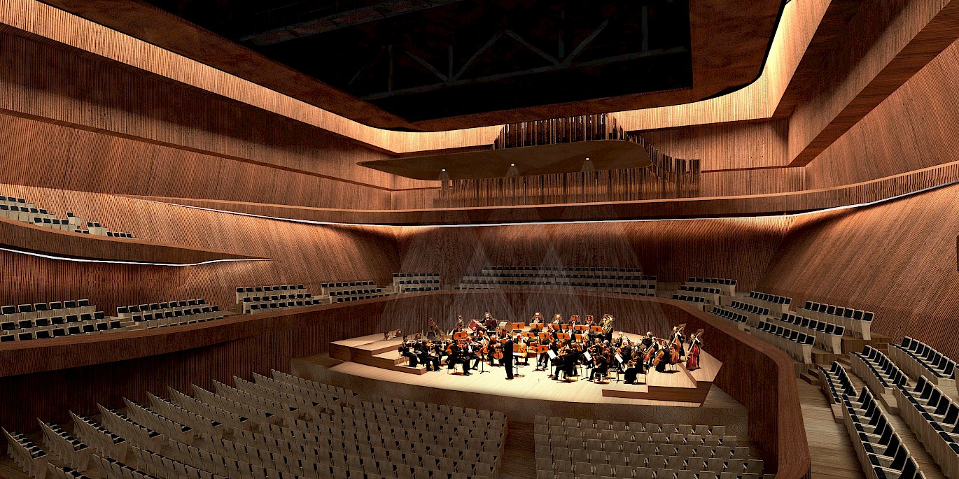 The design of the concert hall completely revolves around acoustics to create a world class concert hall for classical music, as the home for the Janáček Philharmonic Ostrava and as a prestigious venue to attract guest orchestra’s. In order to realize ideal acoustics for the complete symphonic repertoire, the volume of the hall is chosen to be around 20.000 m3. Although this might seem somewhat large for the required audience capacity, it will be necessary to facilitate the whole classical repertoire from chamber music to the large Mahler and Brückner symphonies, choir and organ and everything in between.