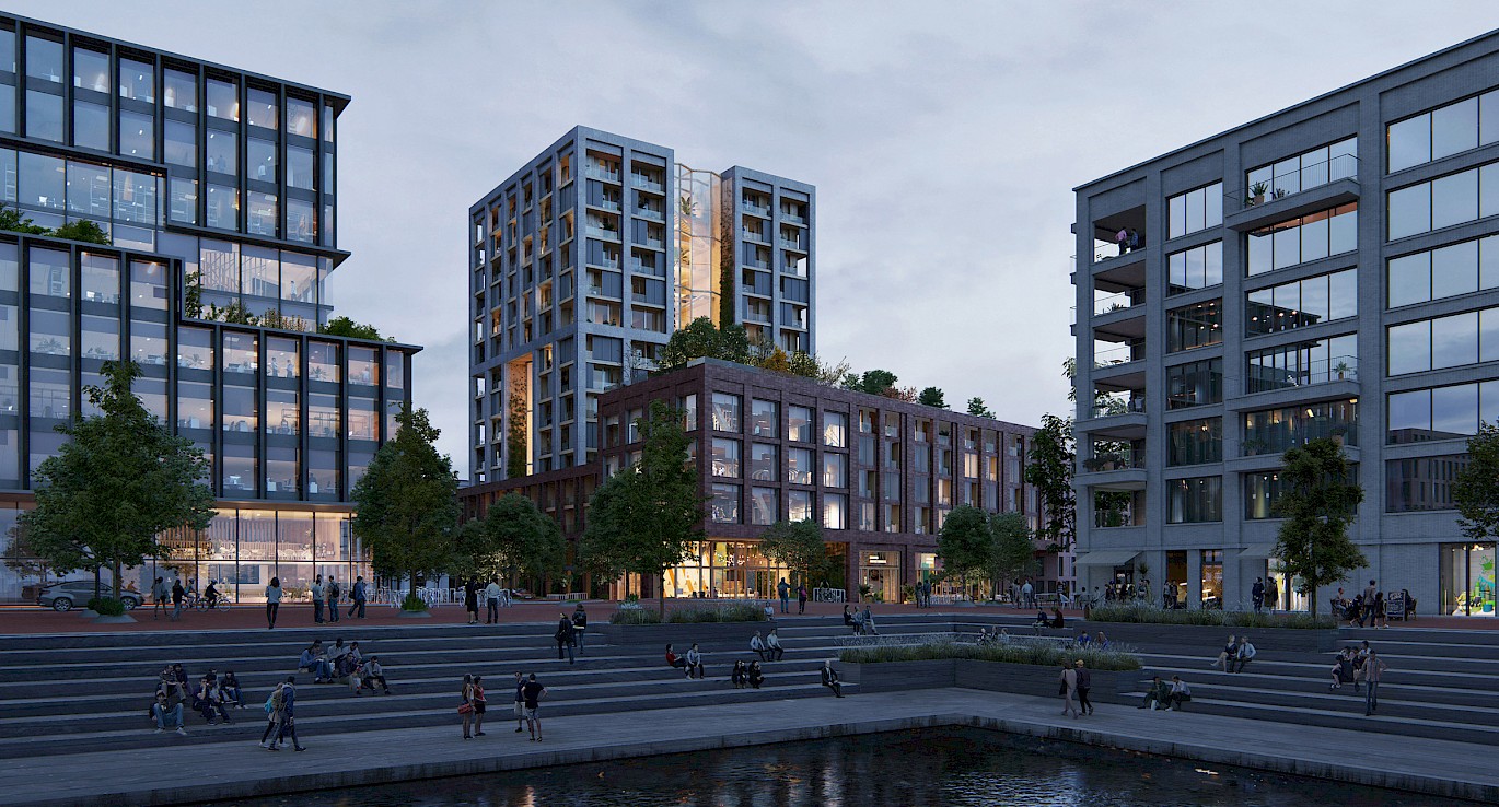 In de Sluisbuurt is het pionieren. Een nieuwe, ongebruikte vlakte waarvoor de gemeente hoge ambities heeft vastgesteld. Het waterplein is de centrale plek in de buurt. Hier komen vier hoofdroutes bij elkaar. Vanaf dit drukke, publieke plein manifesteert Next Level zich als één uitnodigend, samenhangend geheel. Een gebouw met een sterke, eigen identiteit. Stoer, en toch elegant. Stedelijk, en toch groen. Robuust, en toch vriendelijk en uitnodigend. Een gebouw dat er altijd al leek te staan. En toch nog minstens 100 jaar meegaat. Meebewegend in de tijd en daardoor tijdloos. Een herkenbaar gebouw voor deze specifieke locatie, dat zowel de skyline verrijkt als het leven op straat.