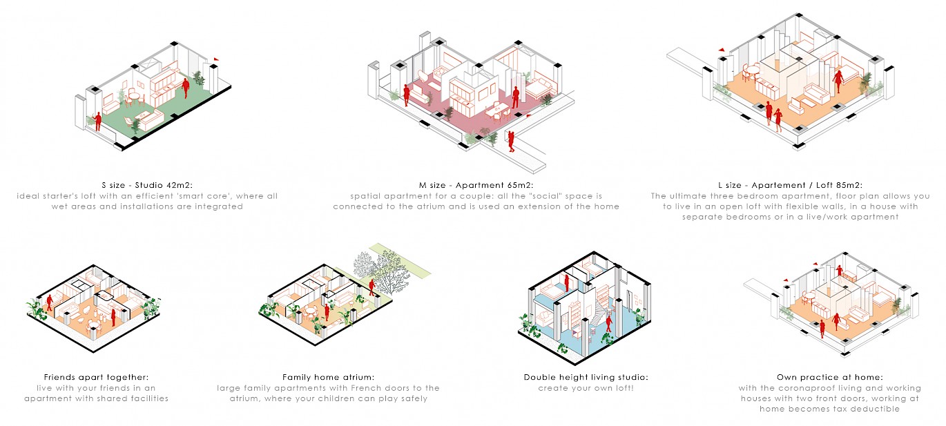 We kunnen veel verschillende woningtypologieën maken doordat we volgens het Open Bouwen-principe bouwen. Drager en inbouwsystemen zijn van elkaar losgekoppeld en inbouwwanden en gevels zijn losmaakbaar. Daardoor zijn flexibele plattegronden mogelijk. En daardoor kunnen we veel woonvormen maken voor een gezonde, gemêleerde, heterogene community met mensen van
