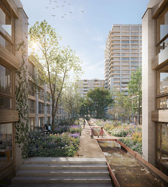 Het verhaal van DUUX is gelaagd. De historische ondergrond met landgoederen en landschappelijk reliëf vormt een belangrijke inspiratiebron. Hoogteverschillen tot negen meter in het maaiveld worden geïntegreerd in het ontwerp van de gebouwen, en zorgen voor een cascade van regenwater en groen. Ook de rijke diversiteit aan woningen en werkplekken draagt bij aan een sociaal gelaagde buurt.