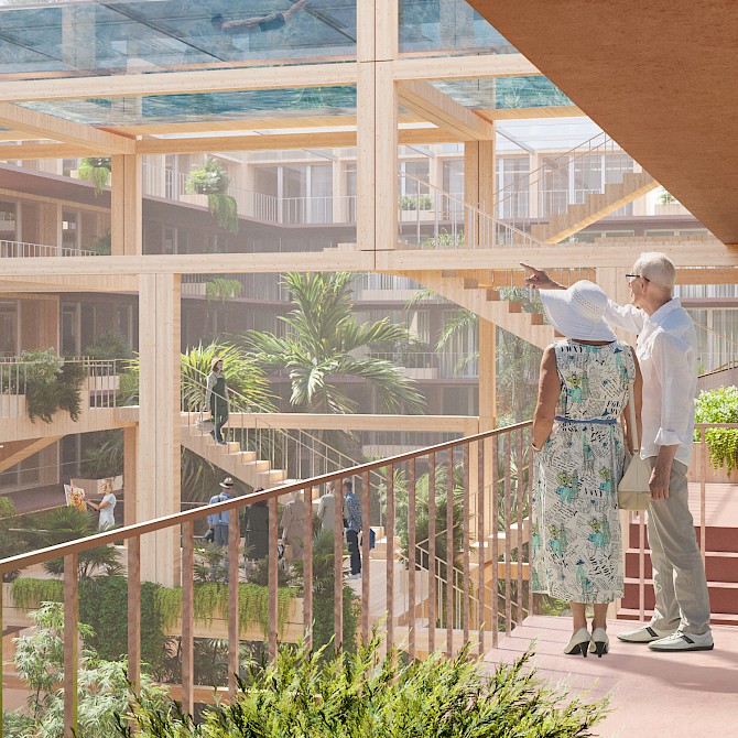 een levendig daklandschap waar ouderen kunnen tuinieren en recreeren. Sport en een actieve levensstijl worden benadrukt. We doorkruisen het blok middels een spectaculair zwembad en greenhouse om zo via de centrale botanische tuin weer op het maaiveld terug te keren. Onderweg zijn brede woongallerijen rondom de centrale botanische tuin juist plekken om te verblijven en te ontmoeten.