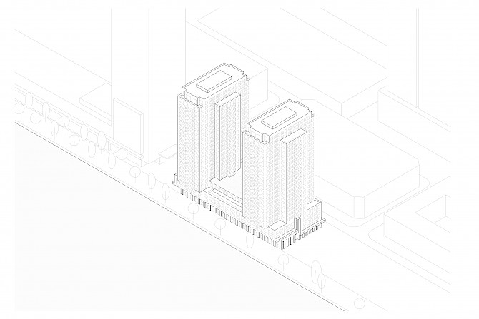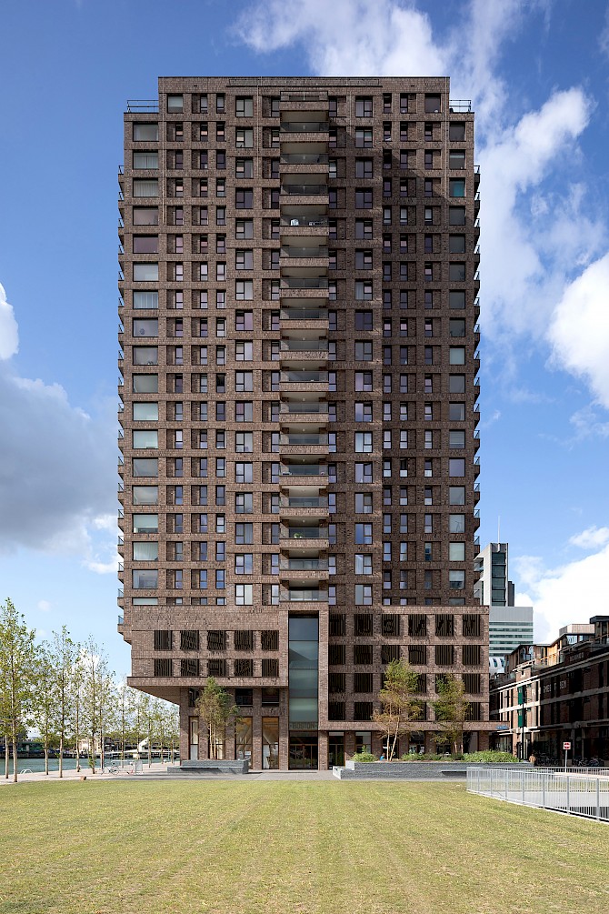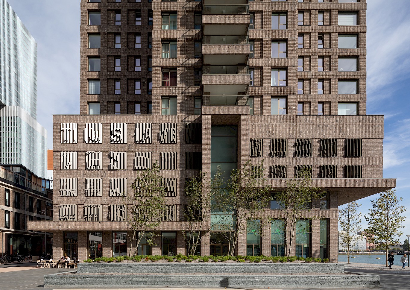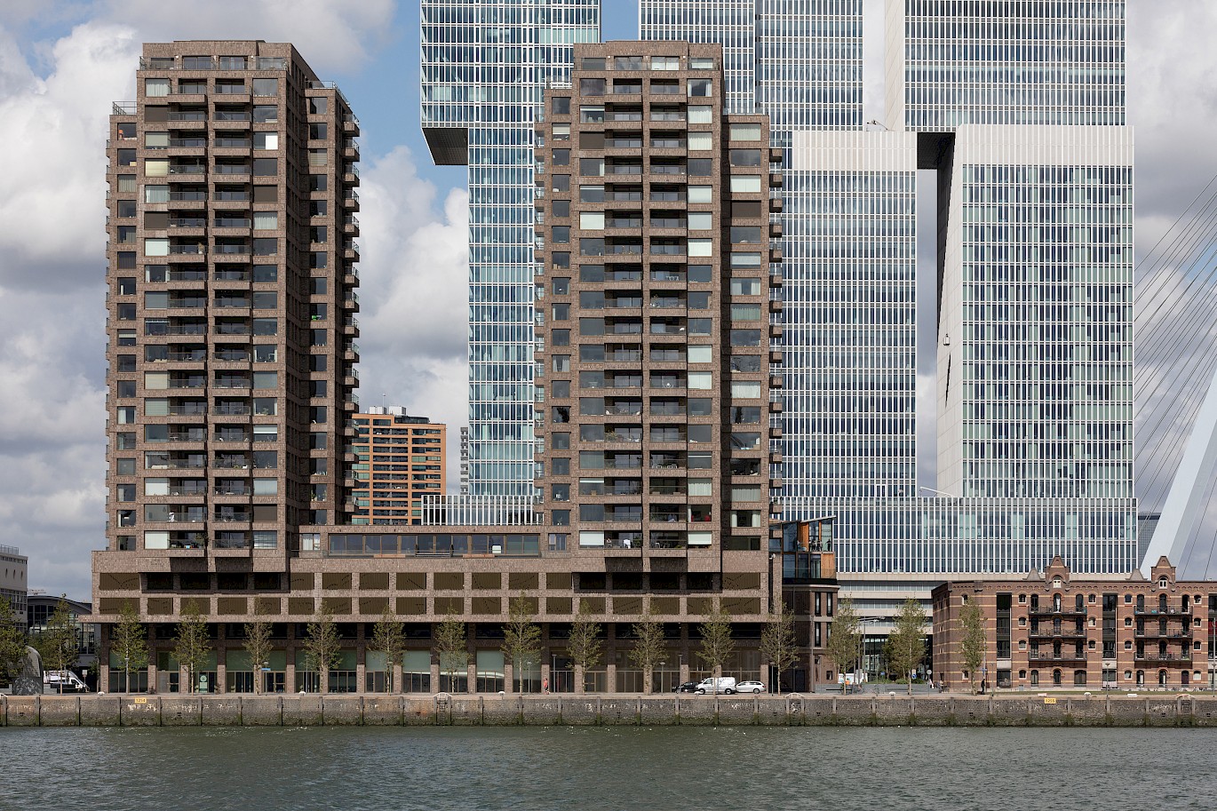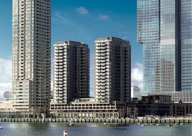 The Wilhelminakade in Rotterdam is shaped by its maritime history. Passenger ships bound for America sailed from this pier and during the 19th and 20th century the pier became a symbol of emigration of Europeans to the United States and Canada. Van Dongen-Koschuch was asked to design two apartment buildings within this historic context, which since 2000 has seen a period of high-rise development. The buildings are located on the southern quay of the pier between the Seattle residential tower designed by Alvaro Siza and the Luxor theatre by Bolles+Wilson.