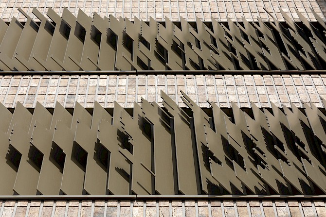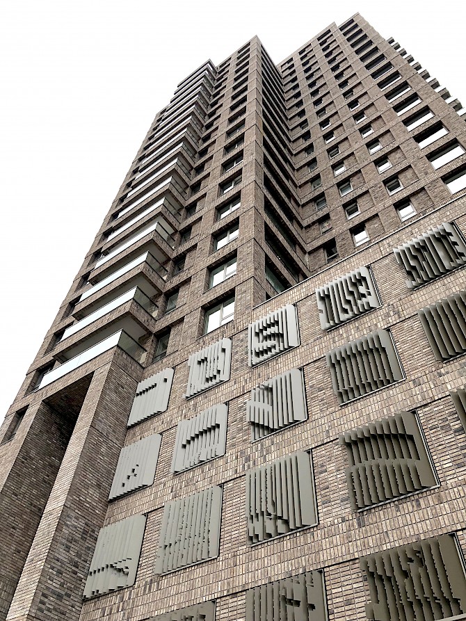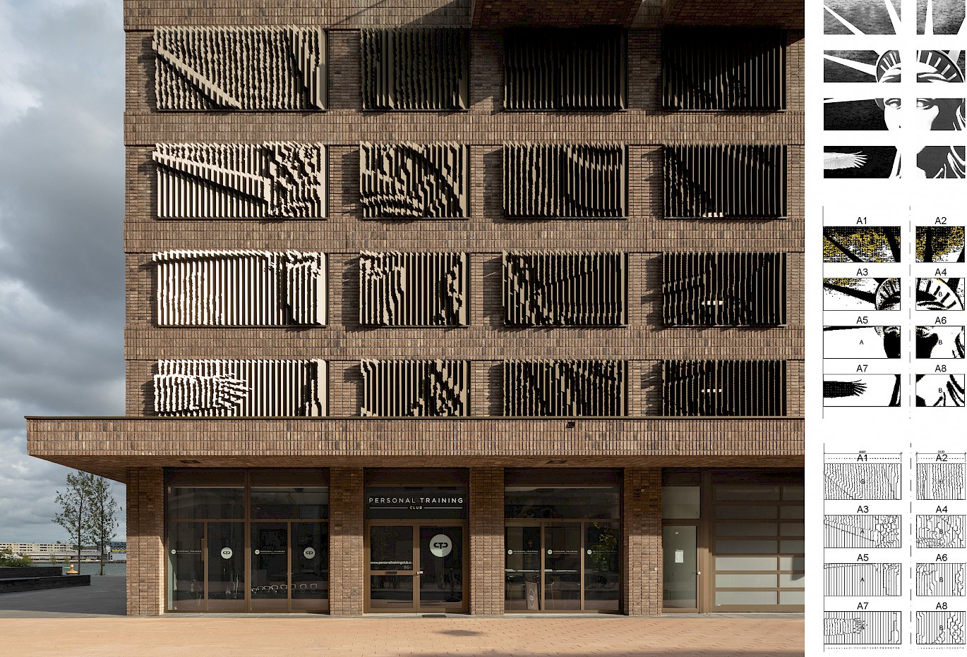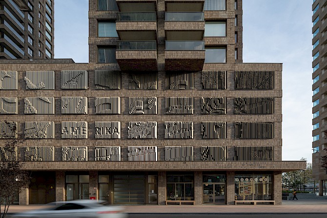 This cross-shaped form results in a slender and elegant volume, along with semi-indoor balconies. The main challenge for the parking garage was to avoid designing an impenetrable box. We therefore developed a façade concept with an artistic intervention. Historical figurative images of have been projected onto a vertical structure of blinds that integrate elements for privacy, natural light and ventilation. From the ground level, the façade is perceived as a play of light and see-through fragments as you walk around the building. This dynamic structure combined with the robust grid of the towers which seem to integrate seamlessly on the Wilhelminapier.