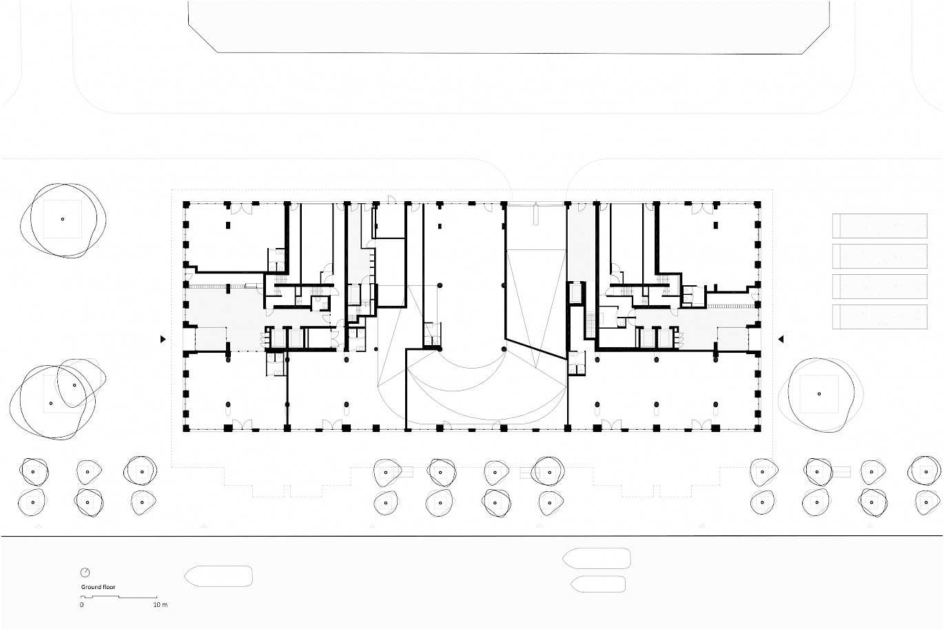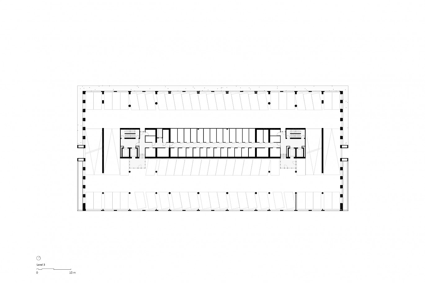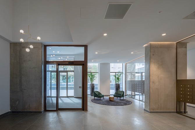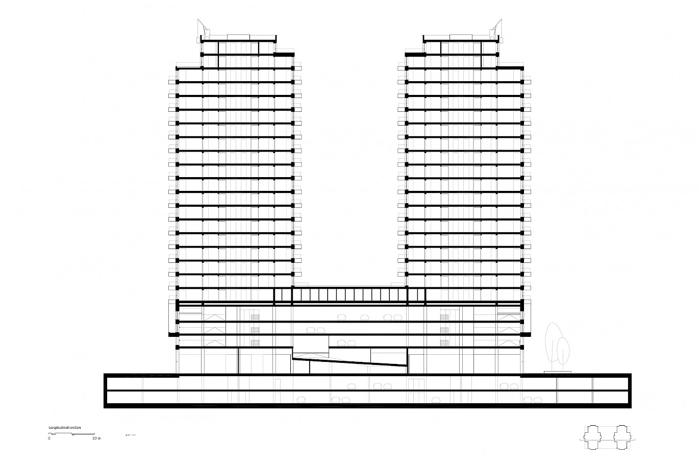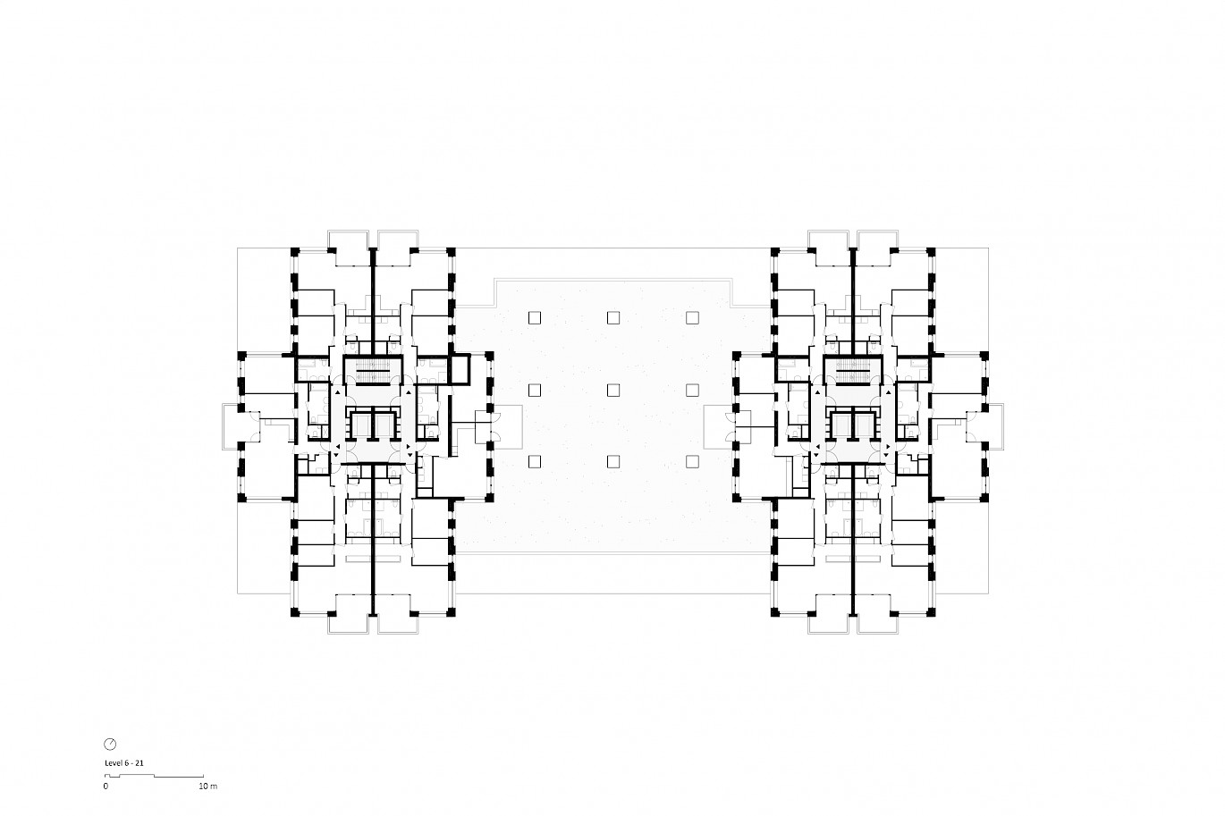 Both towers are 70 meters tall, and stand on a plinth of commercial spaces and a 4-storey parking garage. The floors above house 6 apartments each, to a total of 220 homes. A green roof is the link between the two towers where a large collective outdoor area is situated which has the added benefit of panoramic views over the harbour area as well as a communal meeting space. The cross-shaped floorplans allow for abundant views over the harbour and sunlight during the day.