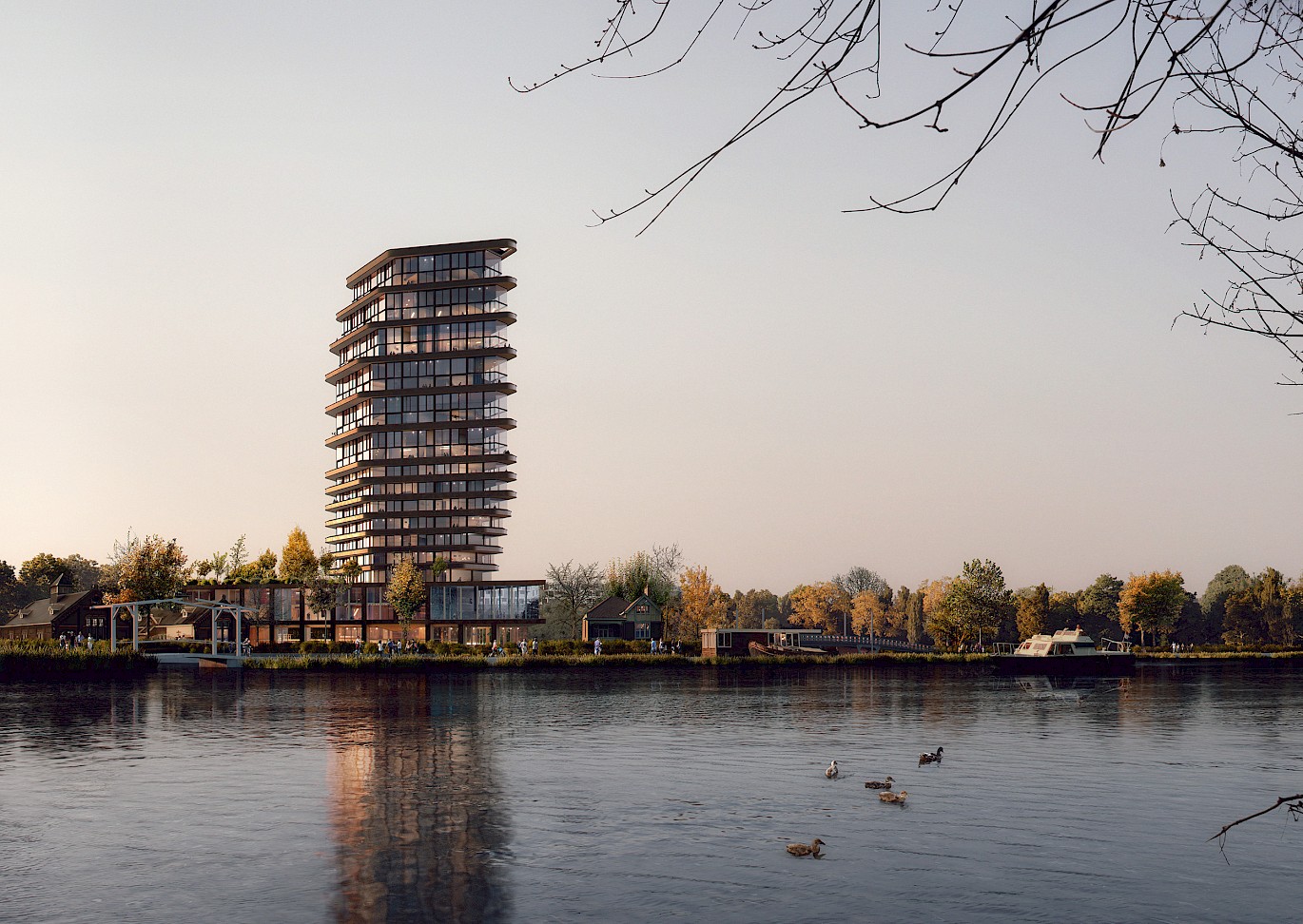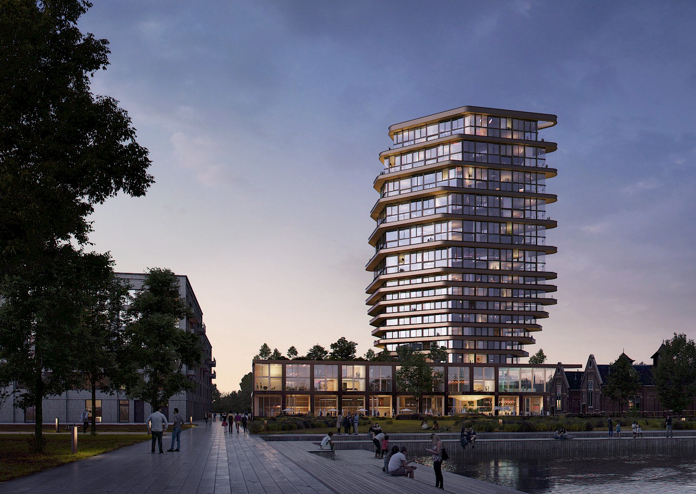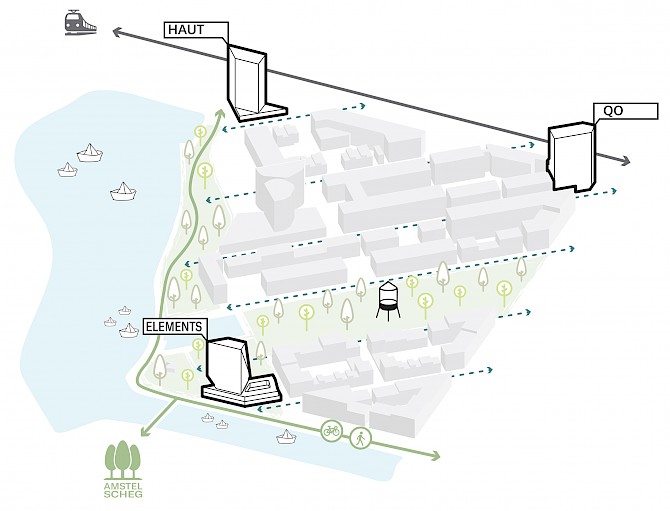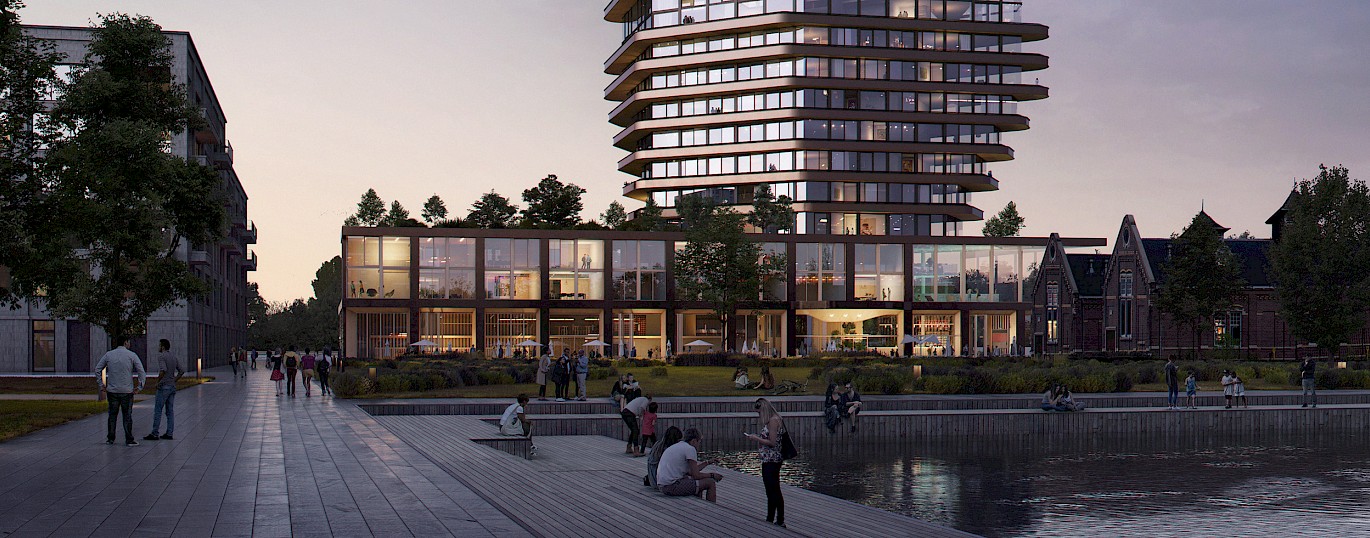 The Amsterkwartier will soon be enriched by a new iconic building. After the development of Haut and the QO hotel, the all-round and sustainable building design "Elements" was selected by the city of Amsterdam as the winning design for the realisation in the new Amsterdam city district. The building, with an approximate height of 70 metres, offers space for 70 medium-priced rental homes and 74 private sector homes, with commercial facilities on the ground floor, and a green woodland courtyard and roof terrace.