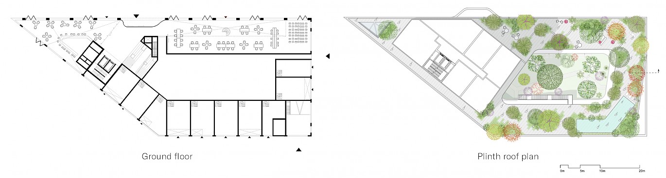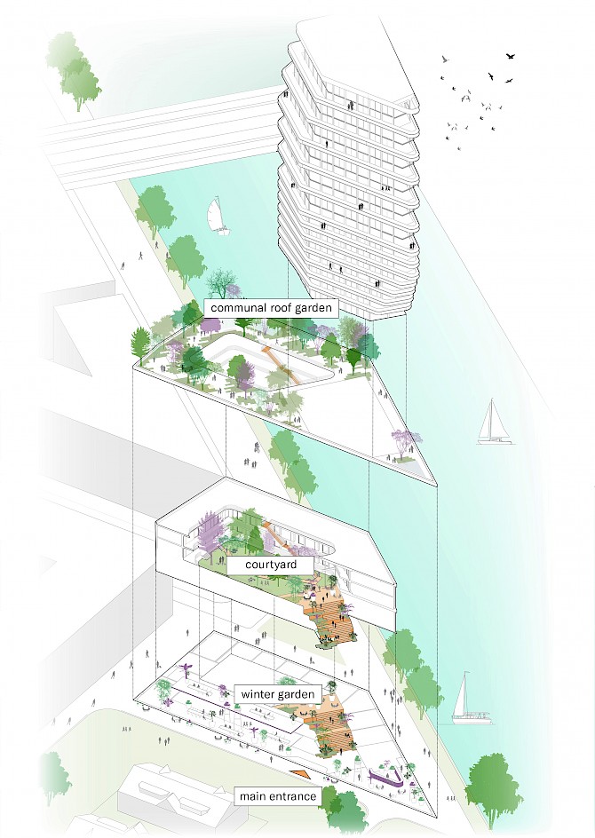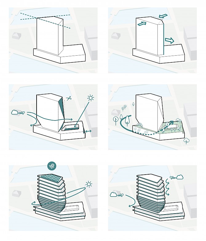 Elements was not designed in a traditional way, but had developed from the various aspects that influenced the assignment, such as the urban envelope, the sun's orbit, daylighting, optimal energy generation, water collection, influence from the wind, and inclusion of green for more biodiversity. All these elements are included in a parametrically designed 3D model in collaboration with Arup.