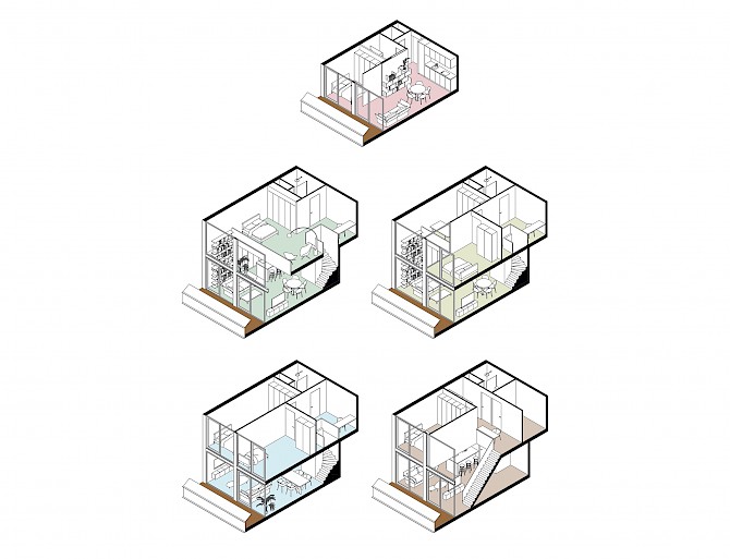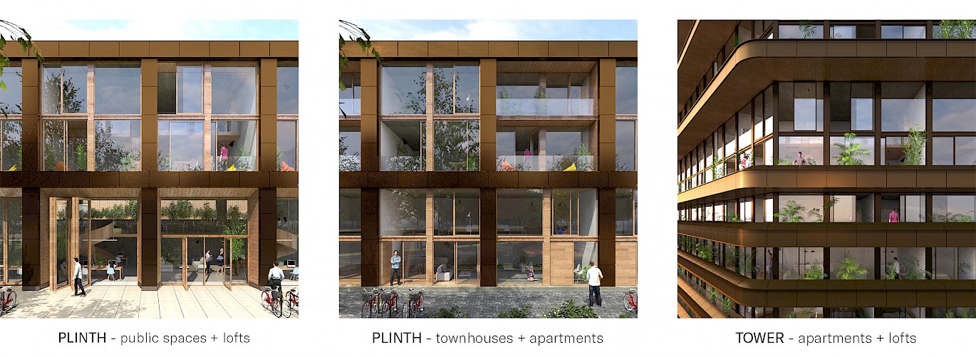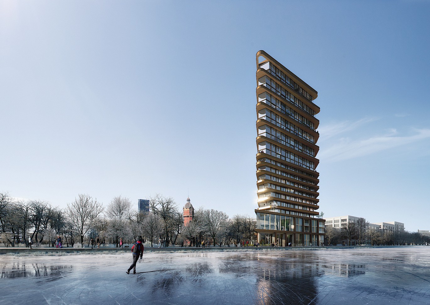 Elements will be an energy-supplying residential tower: from BENG to ENG. With the solar panels integrated in the balcony edges, more than 100% of the energy requirement is generated sustainably. Even more innovative is the hybrid wooden-steel-concrete support structure. This should save more than 50% on the CO2 burden of the used materials. By creating a concrete floor every six meters in height, with wooden floors in between, space has been created for double-height houses where the connection between the two layers is also flexible and adaptable. After all, that wooden floor can quite easily be given cut-outs or extra floor surfaces. Moreover, by creating a radical separation everywhere between the carrier and the installation, between the support structure and installations plus finishing, the houses are also much more flexible in terms of the future.
