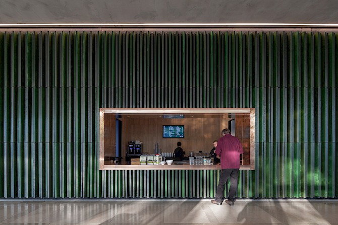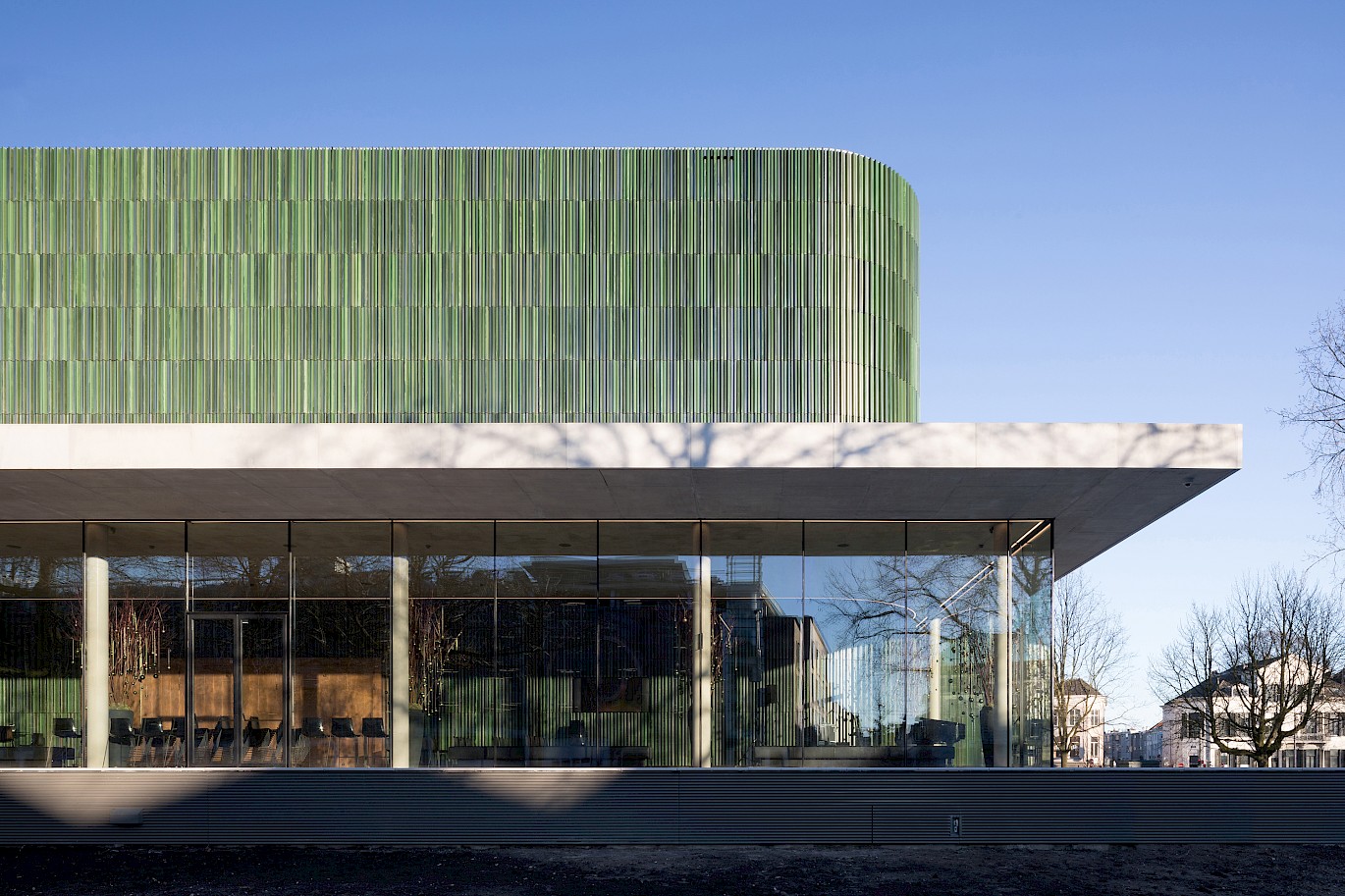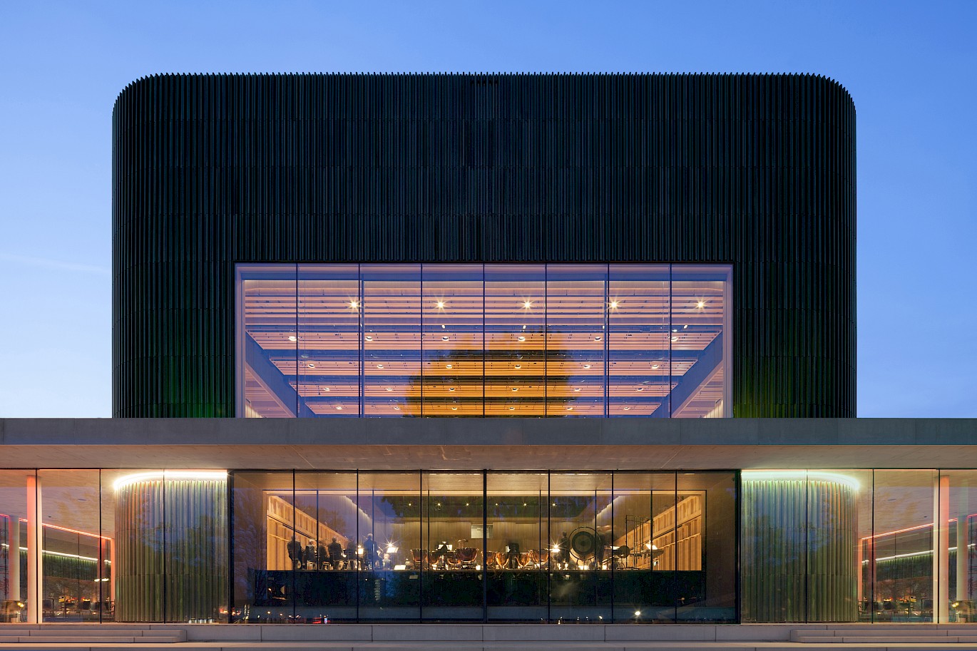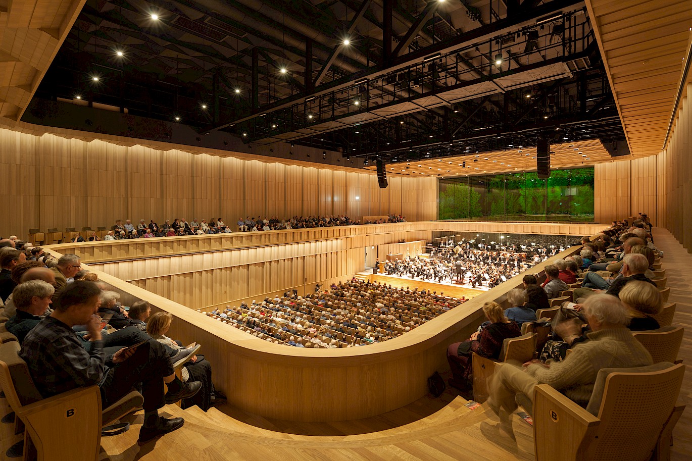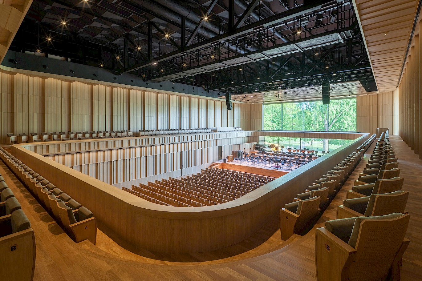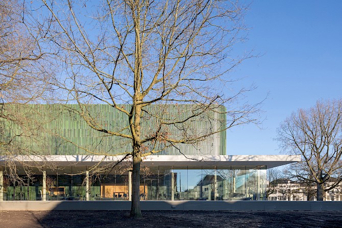 The extension is designed as an inviting and transparent pavilion respectfully complementing the historic building in its beautiful surroundings. The new large concert hall features a large glass window behind its stage that opens up to the park and acts as a botanical backdrop.