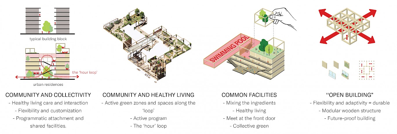This creates a lively and flexible building block that opens up to the city. In this housing concept we introduce the term ‘The Hour Loop’ where people can walk along the building and through all vital functions for a period of time of one hour. This (semi) public ribbon will be architecturally clearly articulated through a wooden structure.