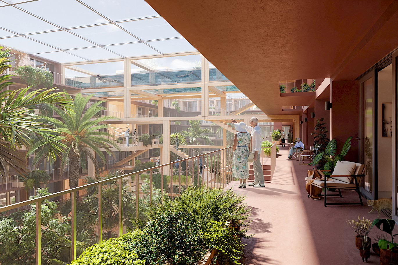 For example, we pass facilities such as a bakery, pharmacy, physio and we ascend to a lively roof landscape where the elderly can garden, recreate and play sports, emphasising and active lifestyle. We cross the block through of a spectacular swimming pool and greenhouse, then via the central botanical garden to return to ground level. On the down, wide residential galleries around the central botanical garden are good places to stay and meet.