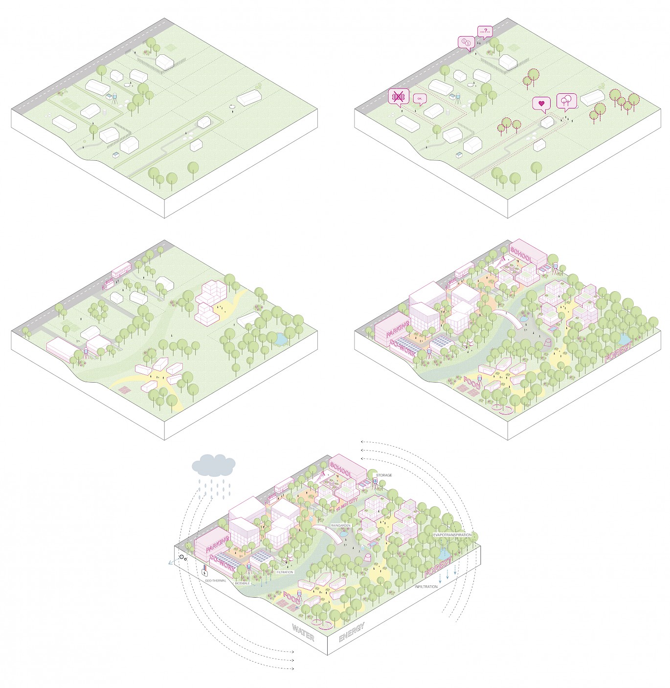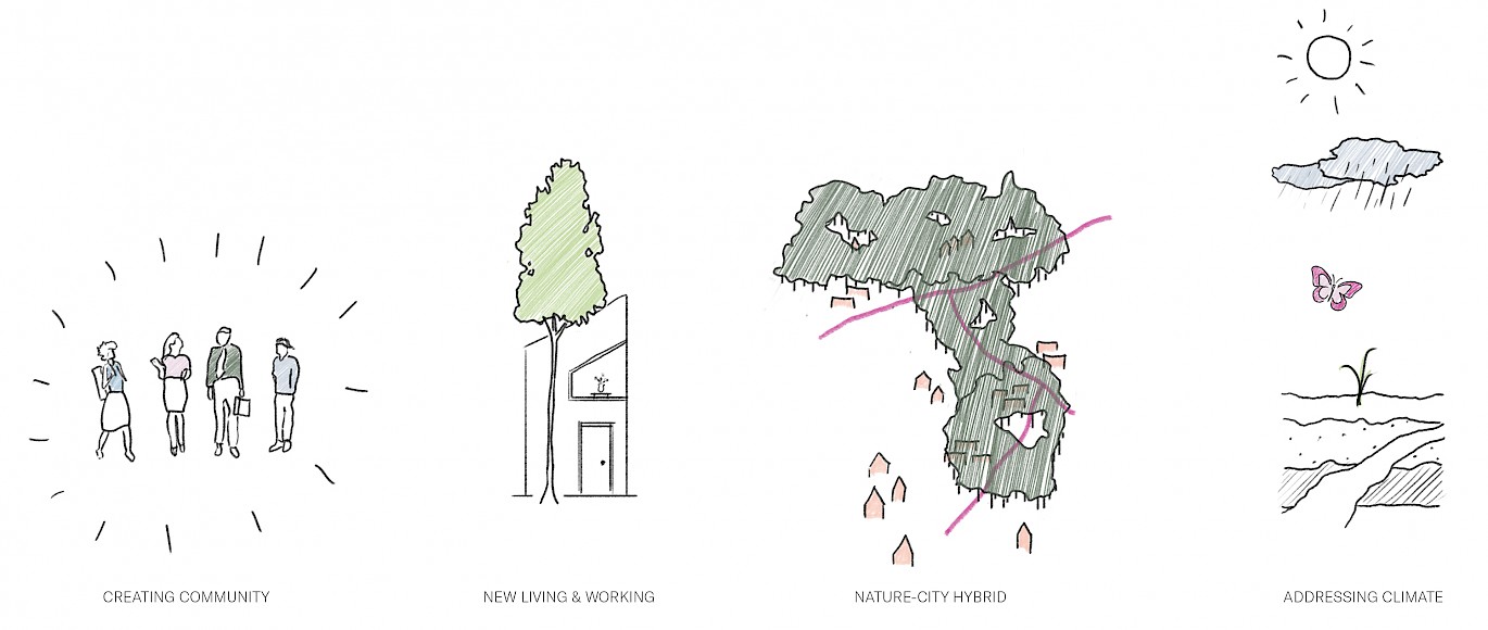 The Waldstadt area is surrounded by woodland which forms the main inspiration for the design of a green, sustainable vision plan which considers vulnerable areas and the integration of nature. Inhabitants of Waldstadt will form a technological society with nature at its core. The area they live in will be a melting-pot of urban culture and natural landscapes that provides for a high level of biodiversity and human health through the wielding of natural principles.