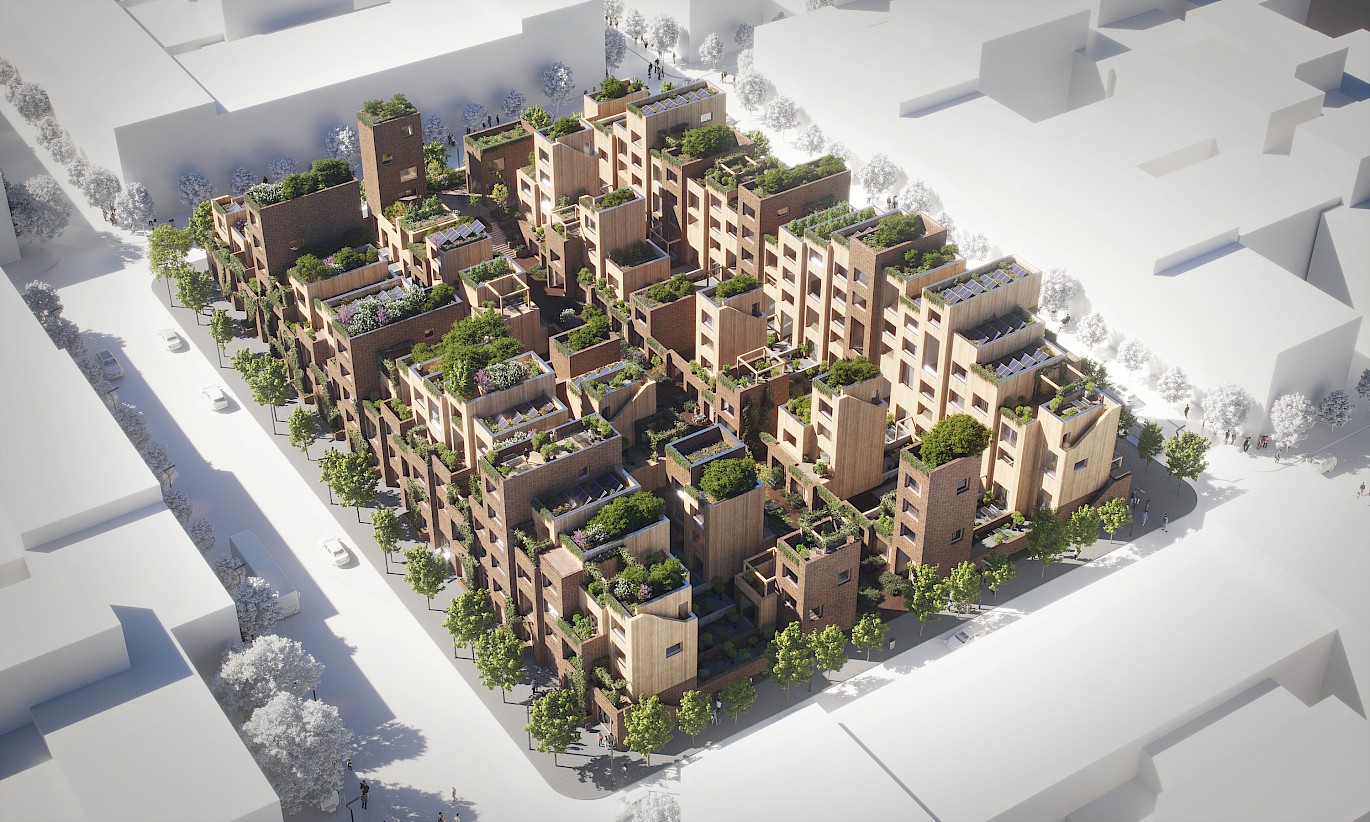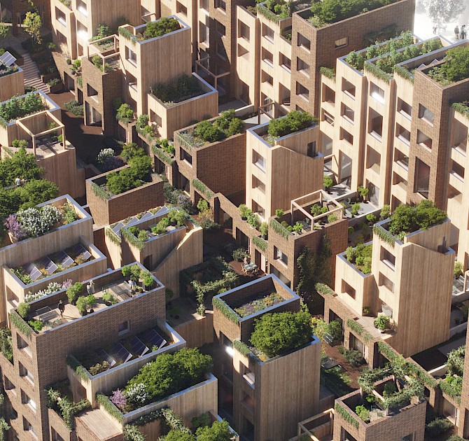 Als robuuste basis ontwerpen we daarom een bakstenen plint waarop door de verschillende bewoners op verscheidende wijzen en met verschillende budgetten en snelheden aangehaakt kan worden met houten opbouwen, pergola’s en terrassen. De bakstenen plint vormt de basis en zorgt voor samenhang, continuïteit en eenheid in beeld.