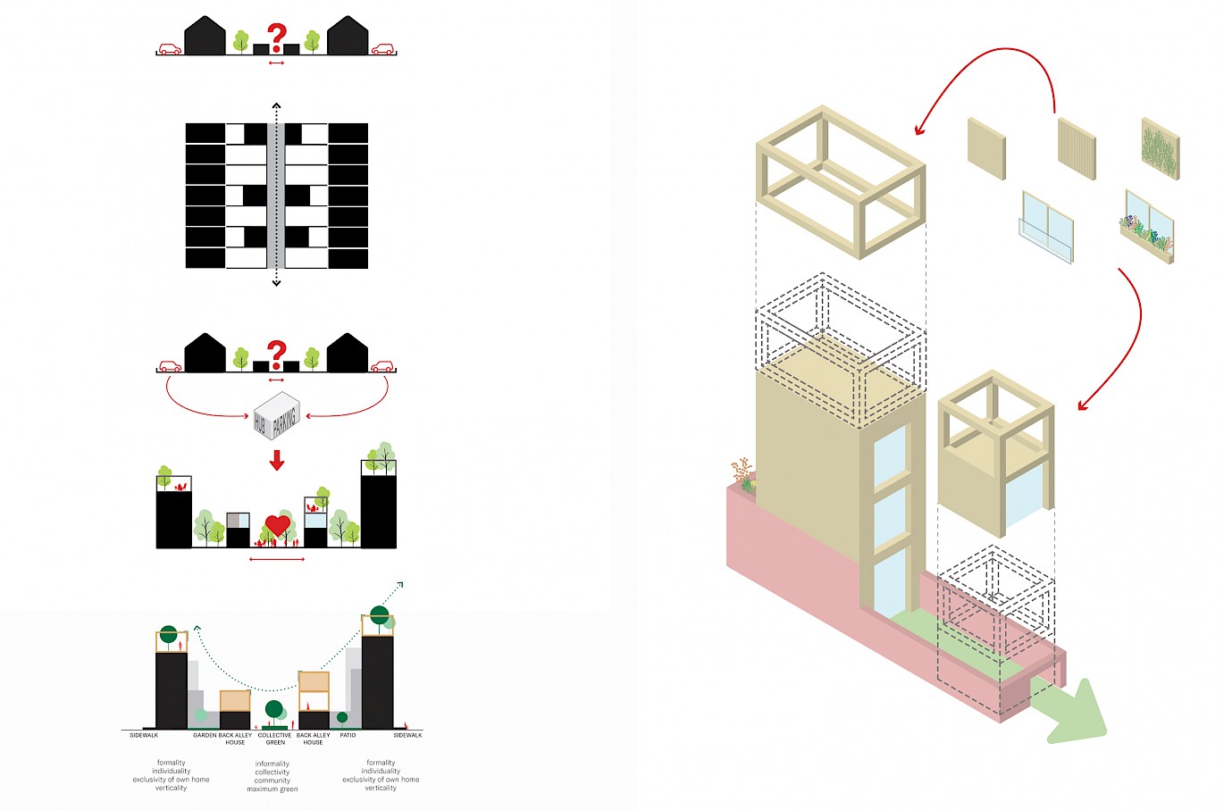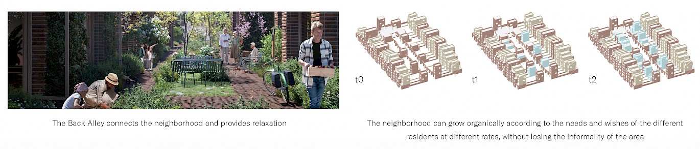De drie dimensionale houten optop wereld zorgt voor variëteit en zorgt ervoor dat de Back Alley organisch kan groeien naargelang de behoeftes en wensen van de verschillende bewoners, zonder dat de informaliteit van het gebied verloren gaat. Modulair en flexibel van opzet met ruimte voor customization van de eigen woning binnen een robuust framework.