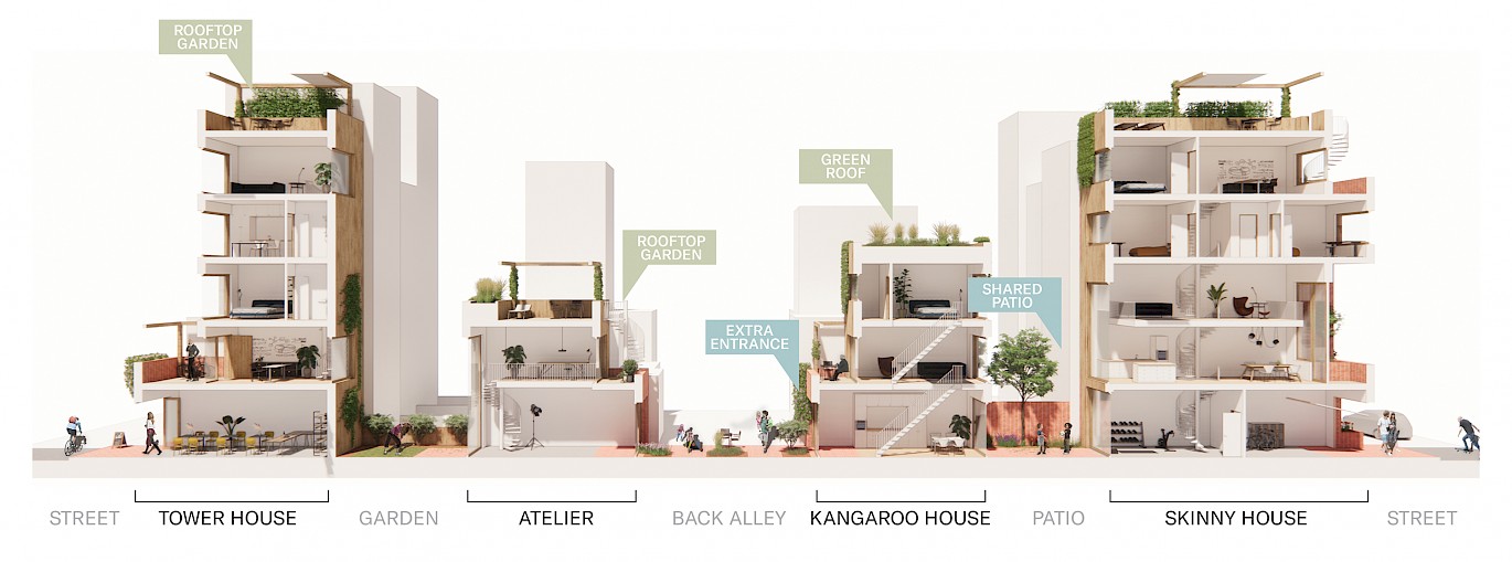 Door de bergingen in de achtertuinen te transformeren naar een volwaardig programma zoals een werkhuis, een tuinstudio, een kangaroe woning, een atelier of een plek waar de studerende zoon of dochter kan gaan wonen ontstaat een zogenaamde meergezinskavel. De ‘achterhuizen’ kunnen gefinancierd worden als onderdeel van de reguliere hypotheek voor het ‘voorhuis’ en de tussentuin verwordt tot collectieve patio en verbinder tussen de twee huizen.