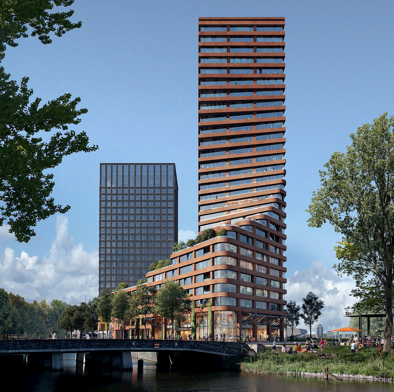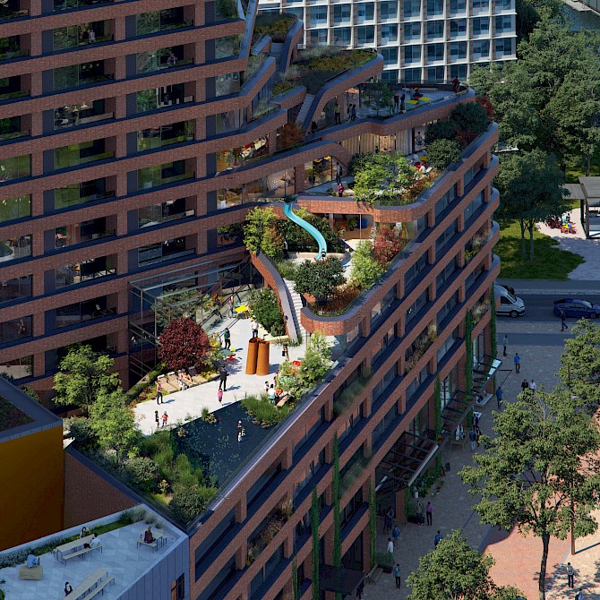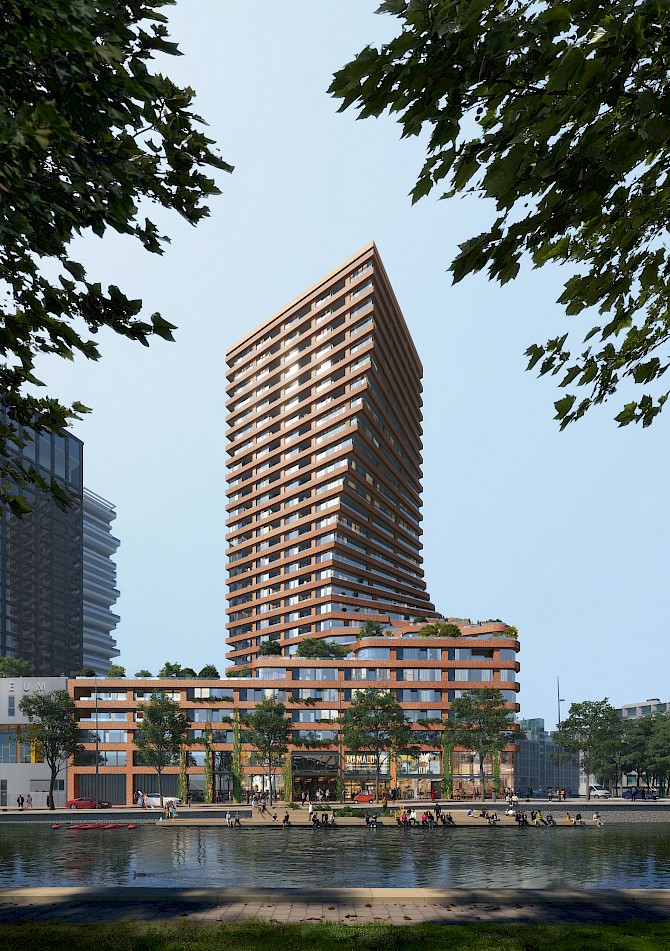 Our design searches for a new generation of high-rise buildings that connect the skyline with the street life, while introducing stepped building parts as a collective roof landscape and outdoor space for residents. Materialisation is site specific and the choice for an innovative use of traditional brick stems from the desire to create a building that has its own identity while reaching out to the surrounding environment.