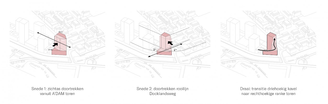High-rise is becoming and increasing popular form of urban living in Dutch cities. This Amsterdam inspired residential building manifests itself as an elegant tower designed with precision; where the dynamics of the surroundings are architecturally translated into a location specific sculpture. By introducing a "torque" around the vertical line in the center, the triangular base gradually rises around this point, merging seamlessly into a curved line of the tower silhouette.