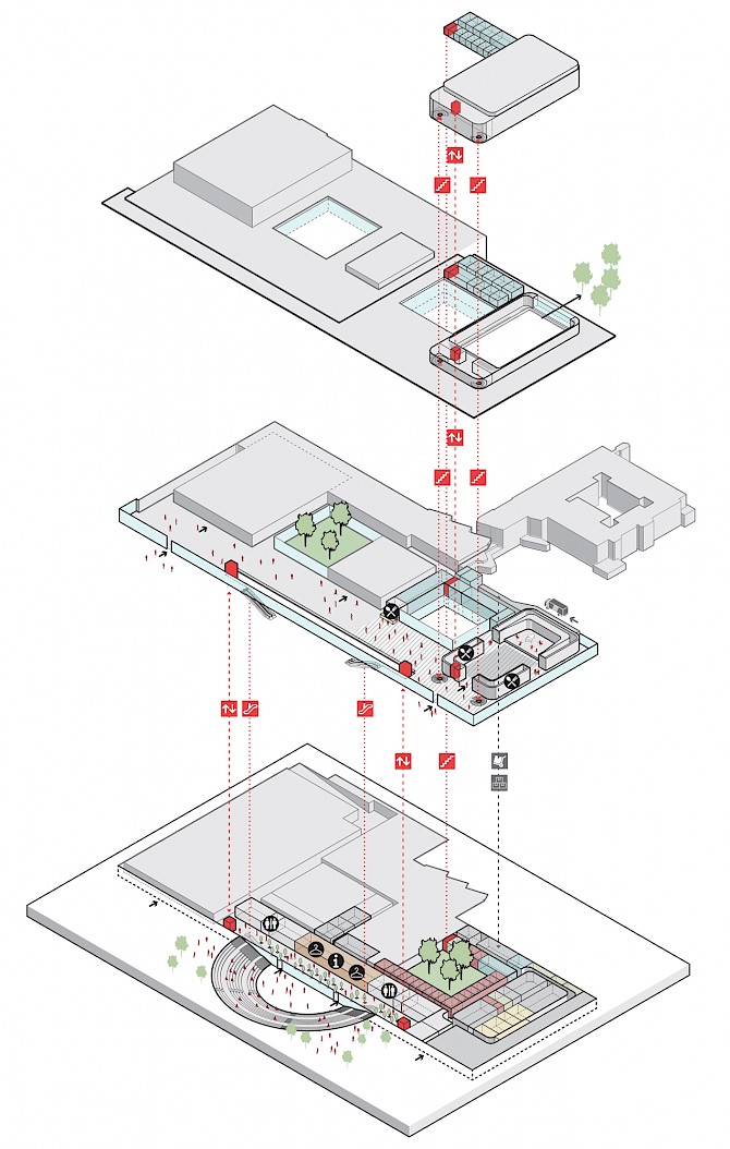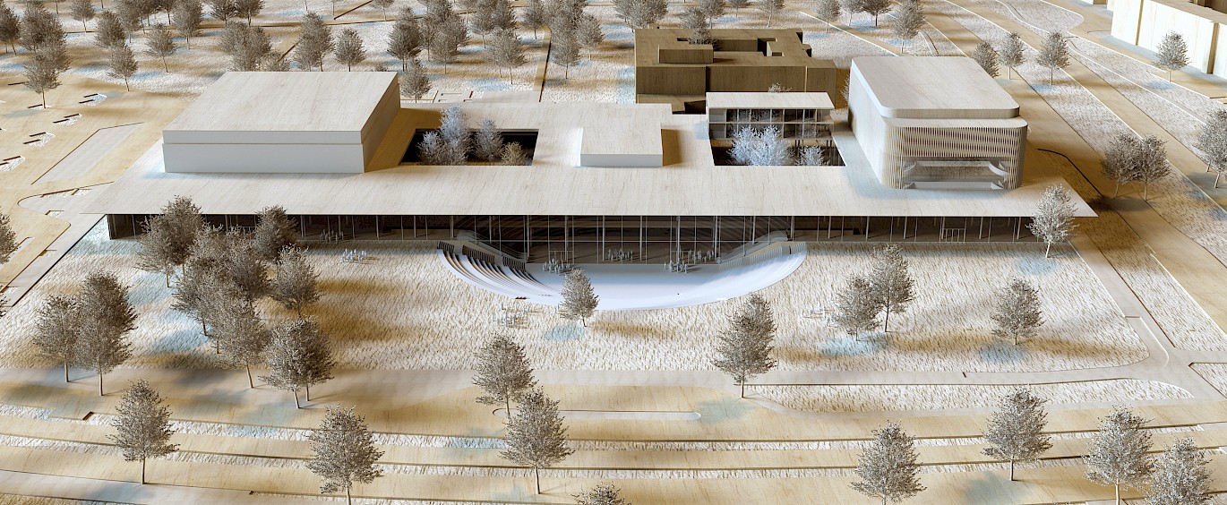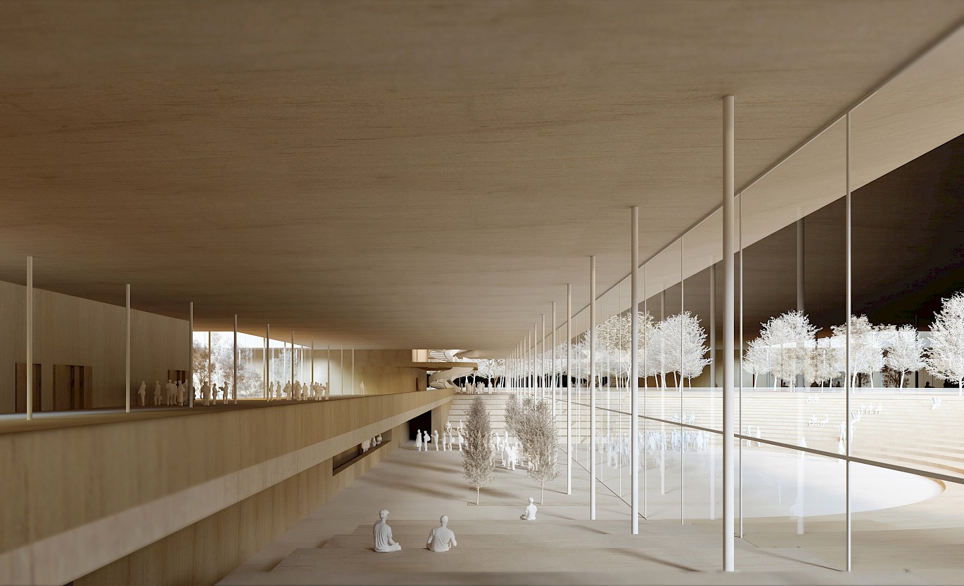 This complex is located in the green park, to which a cultural-historical part will be added on the forecourt; the amphitheater. The entrances to the ensemble are concentrated in the central area of the new building. They are located on the ground floor next to the amphitheater and are connected inside via escalators and elevators to the central cloakroom and toilets or via the amphitheater's external stairs with new entrance doors.