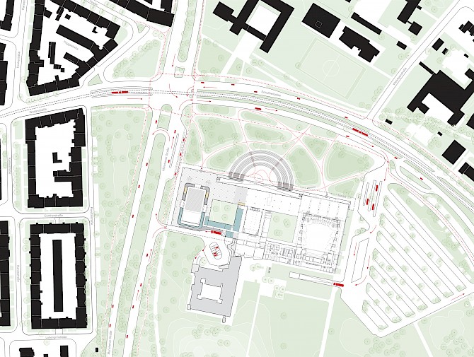It represents a landmark in urban planning and thus forms a transition from the park to the city centre as well as a better connection with the city centre and public transport. In this way it is possible to program the public space in a very easy and efficient way.