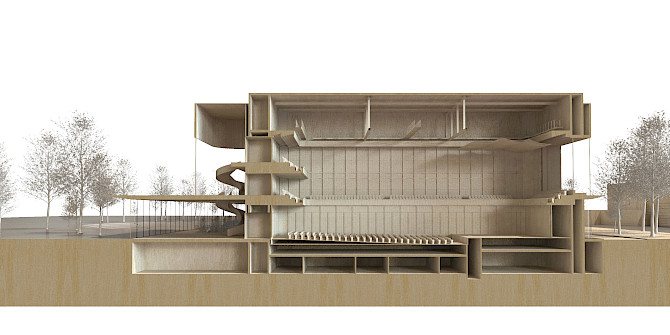 A new multifunctional hall is designed with movable floors and variable acoustics through acoustic movable panels, allowing a great diversity (orchestral performances in the existing classical hall, classical and popular 'chamber music', symphonic music and amplified music, jazz, pop and world music in the new hall and many musical performances in the amphitheatre) and a real richness of all possible musical uses. This approach goes for both existing halls.
