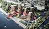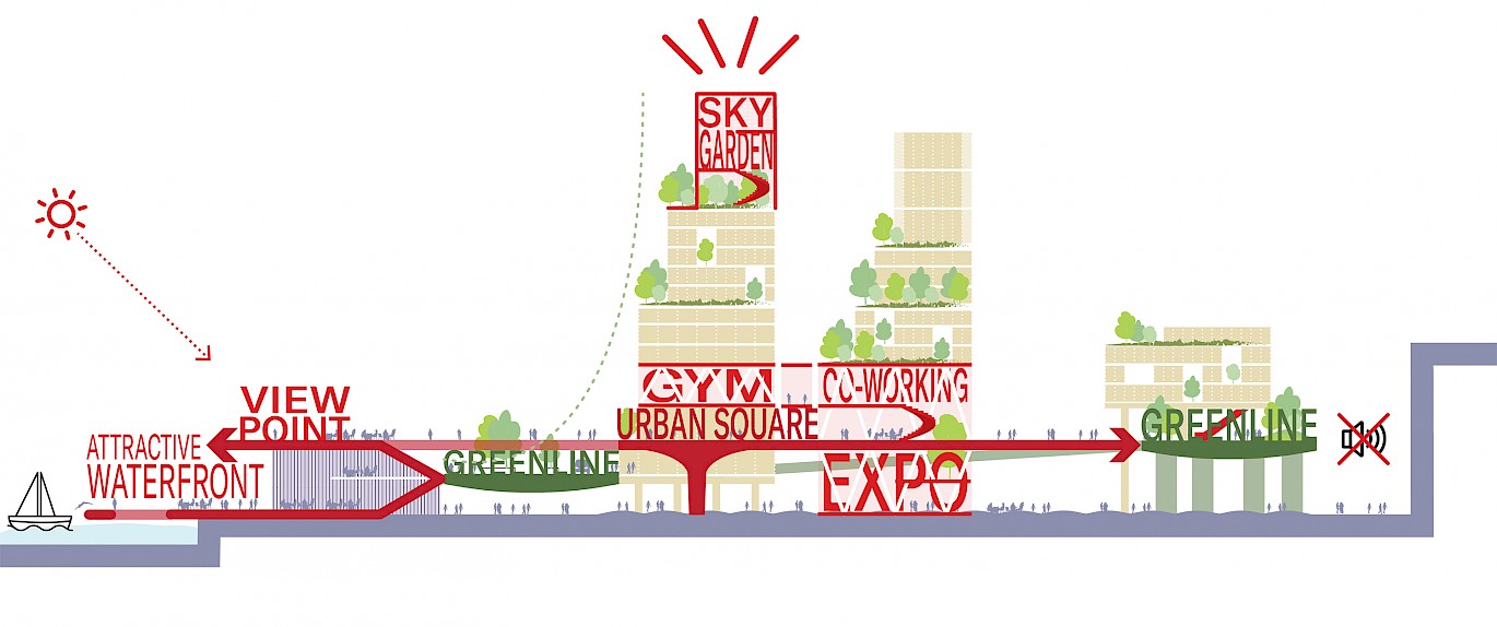 Levendige waterkant verbonden met de groene lijn en met de stad.