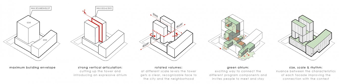De toren oogt slank en krijgt een verticale verschijningsvorm door de introductie van het atrium, een buitenruimte in de torens. De draaiing van het atrium zorgt voor meerdere atria en alzijdigheid, vanuit het gebouw naar de stad en vice versa. Door deze draaiing en de onderscheidende en expressieve vormgeving zijn de atria duidelijk herkenbaar, van veraf en van dichtbij en van alle zijden. Ook ontstaat hierdoor een gelaagdheid van plint, tussenlaag en top, met een oriëntatie op de straat, de buurt en de stad.