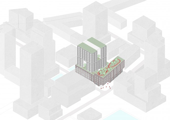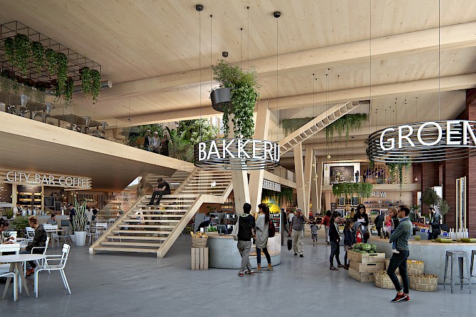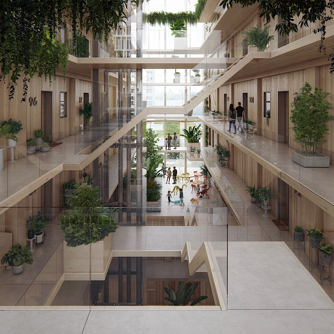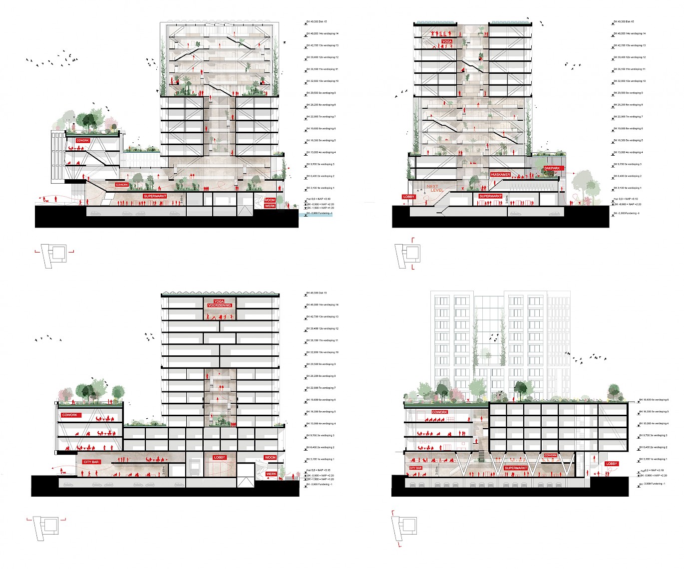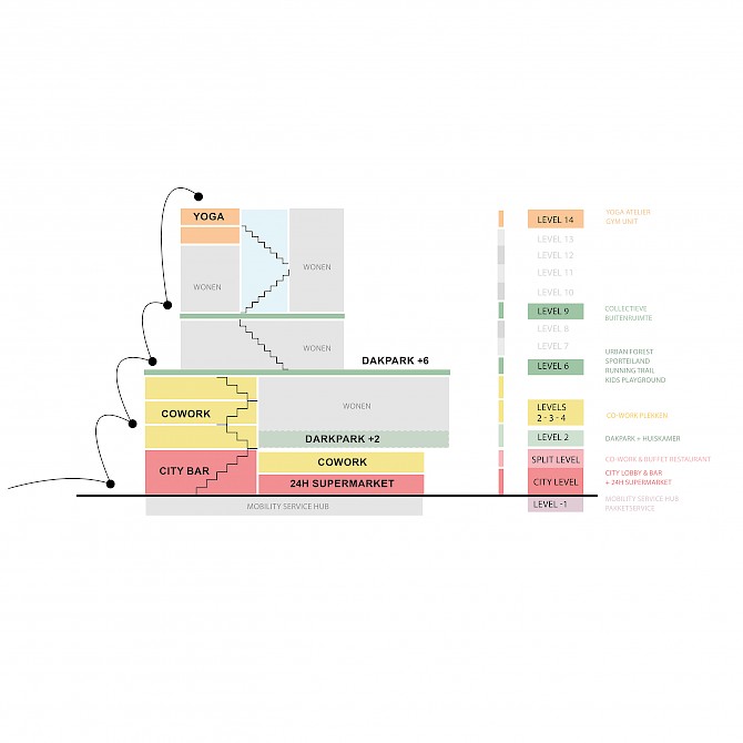 Next Level biedt een multifunctioneel programma door het hele gebouw, waarmee we een levendige omgeving creëren op alle niveaus. Met woningen, woonwerkwoningen, co-workingspaces, een markthal als bijzondere supermarkt, daktuinen en atria met verschillende landschappen, gedeelde ruimtes voor sport en samen zijn, en een mobiliteitsservice. Alle functies zijn via de markthal, de atria en brede, open trappen met elkaar verbonden. Een zichtbaar verticale stad.
