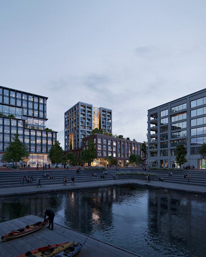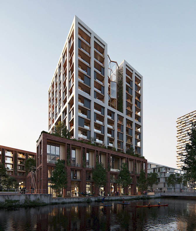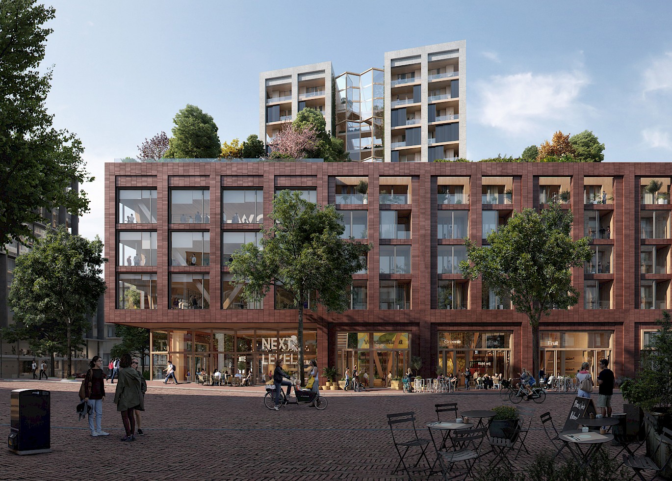In de Sluisbuurt is het pionieren. Een nieuwe, ongebruikte vlakte waarvoor de gemeente hoge ambities heeft vastgesteld. Het waterplein is de centrale plek in de buurt. Hier komen vier hoofdroutes bij elkaar. Vanaf dit drukke, publieke plein manifesteert Next Level zich als één uitnodigend, samenhangend geheel. Een gebouw met een sterke, eigen identiteit. Stoer, en toch elegant. Stedelijk, en toch groen. Robuust, en toch vriendelijk en uitnodigend. Een gebouw dat er altijd al leek te staan. En toch nog minstens 100 jaar meegaat. Meebewegend in de tijd en daardoor tijdloos. Een herkenbaar gebouw voor deze specifieke locatie, dat zowel de skyline verrijkt als het leven op straat.