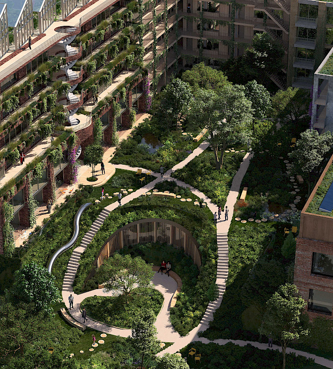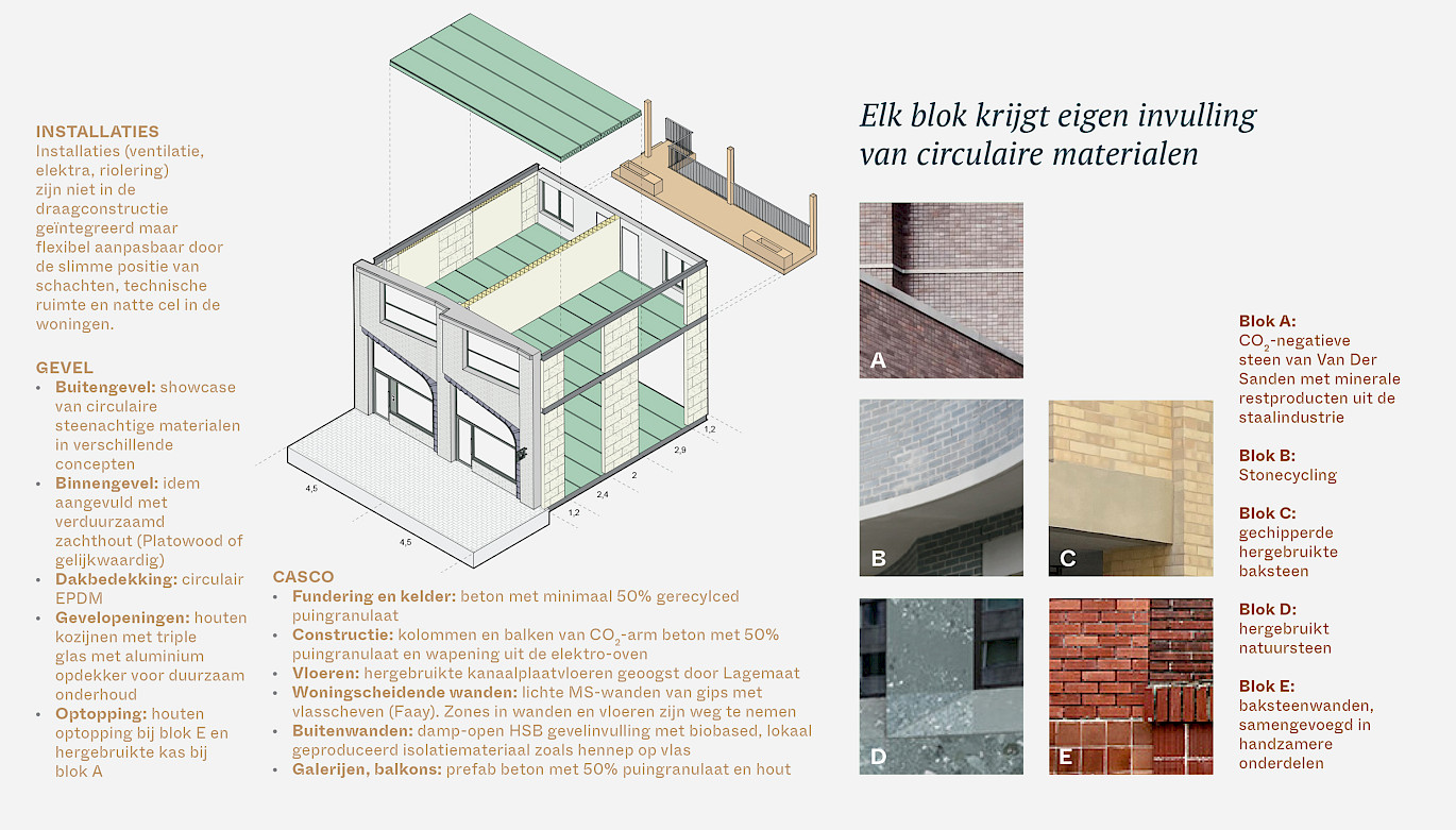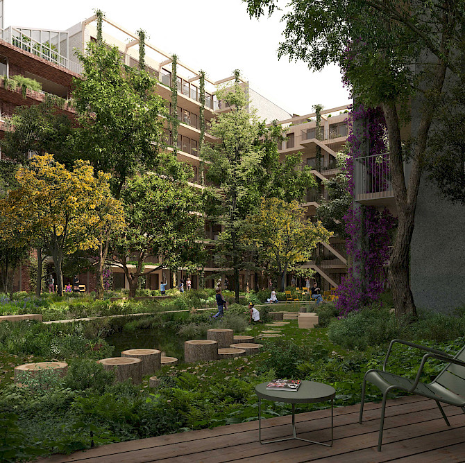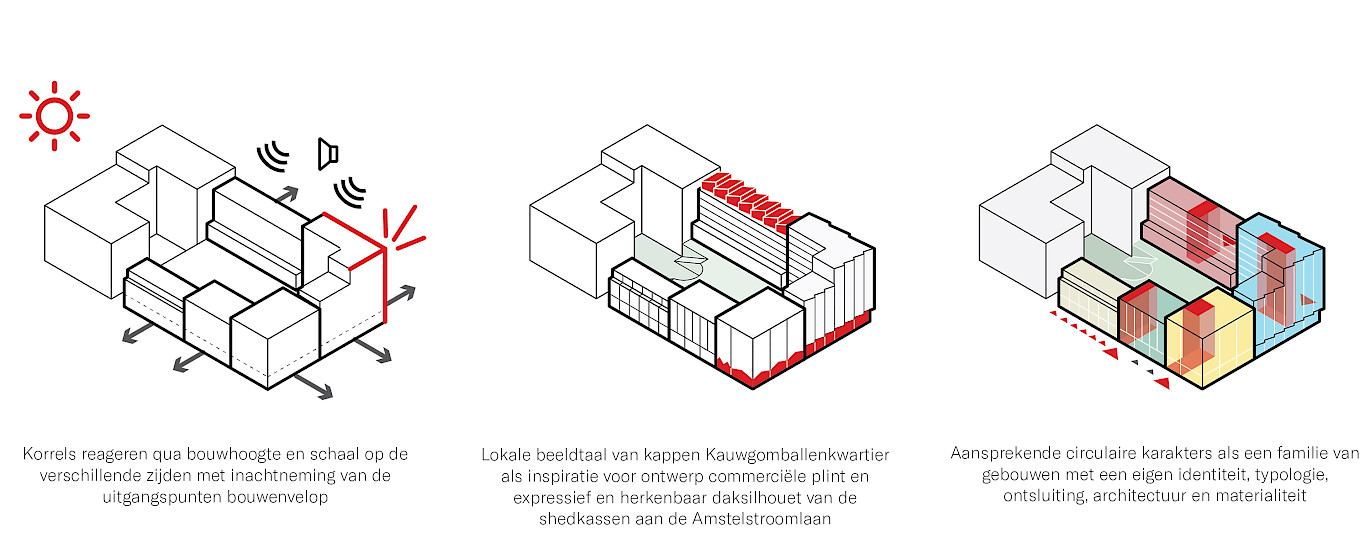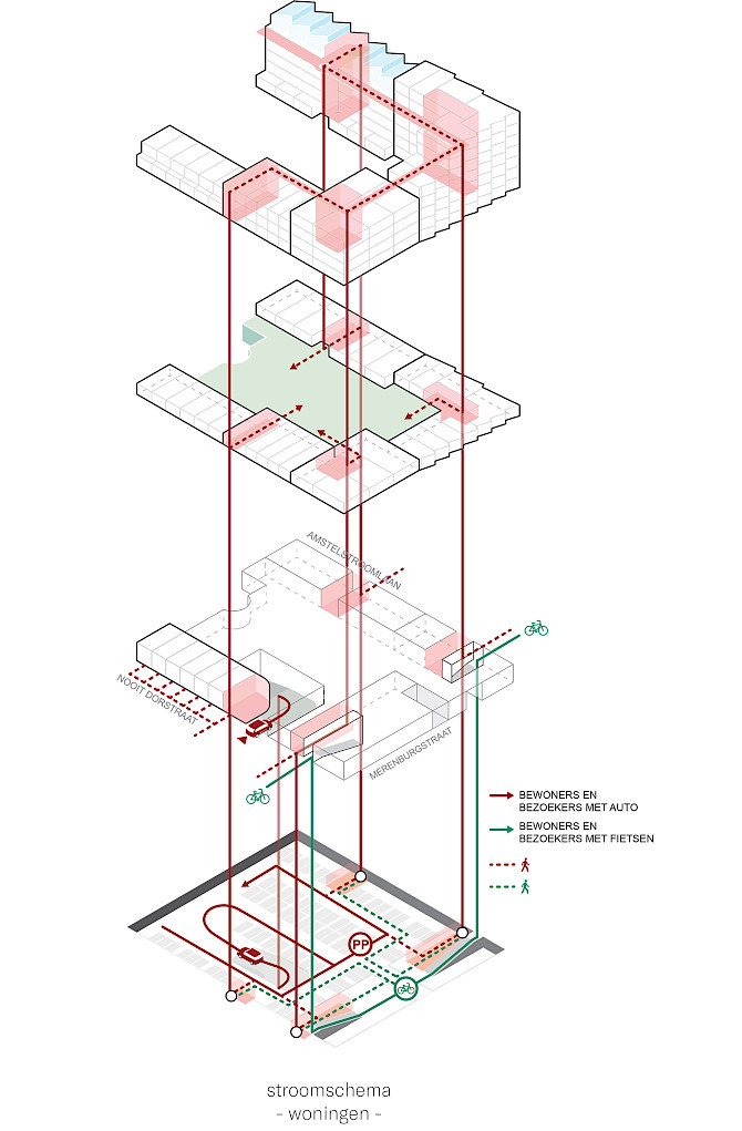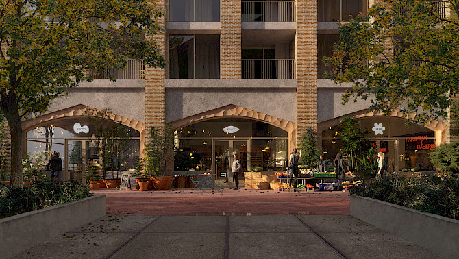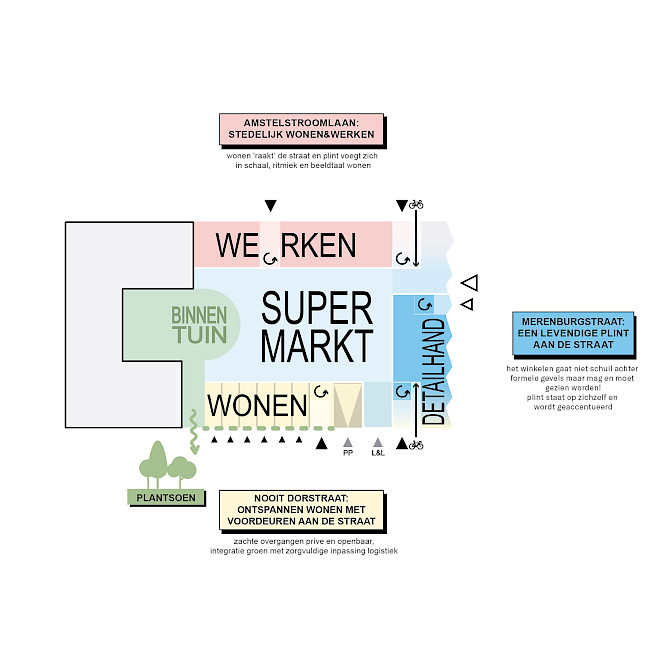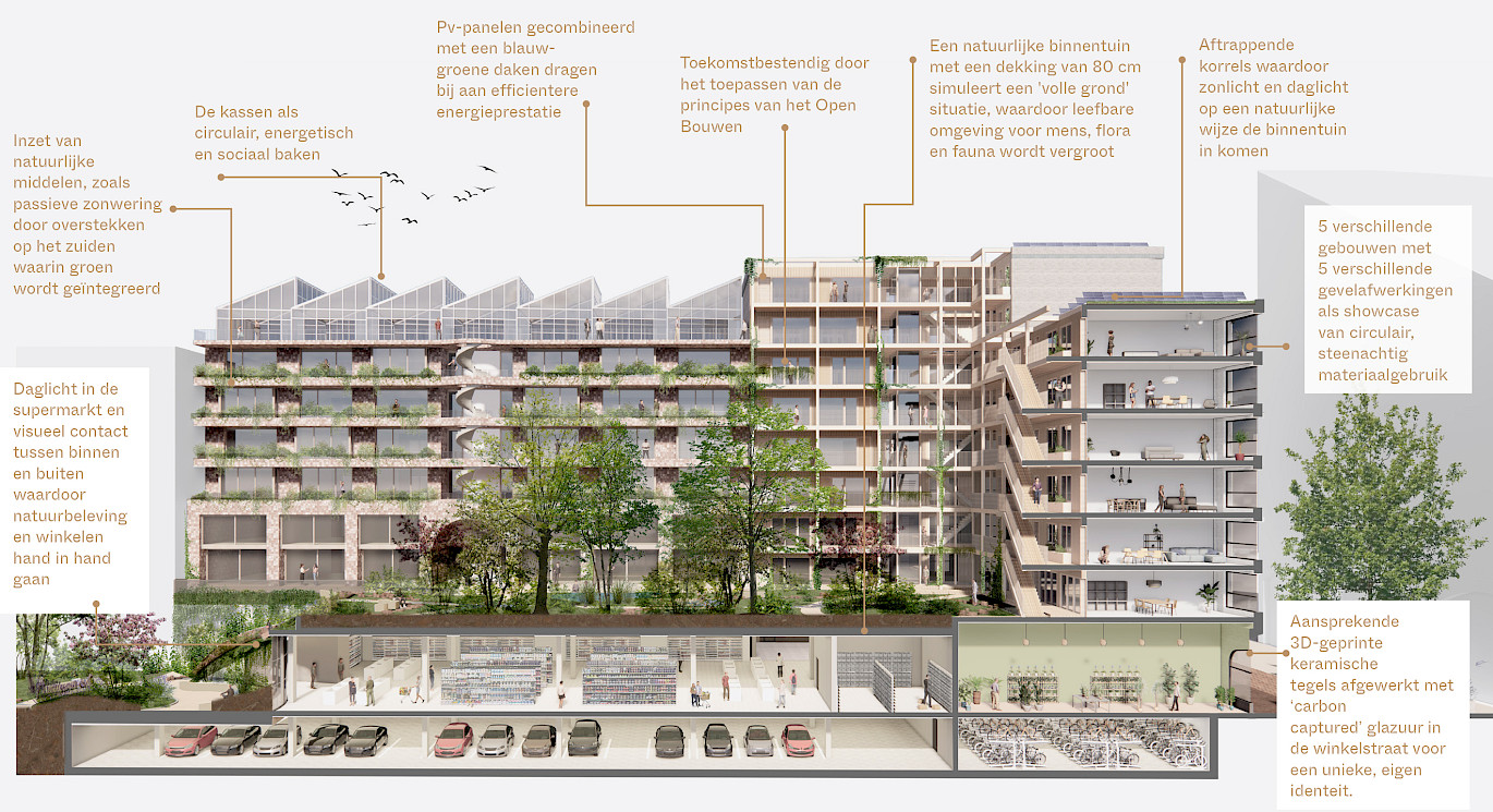 Het ensemble bestaat uit 120 verschillende appartementen, detailhandel, een Hoogvliet supermarkt en werkruimten. Door deze veelzijdige en rijkgeschakeerde programmering zal een sterk stedelijke plek ontstaan waar mensen worden uitgenodigd om te verblijven, ontmoeting wordt gestimuleerd en mensen de ervaring wordt geboden dat ze er samen zijn en in elkaars gezelschap verkeren. Het ontwerp omvat een gelaagde natuurbeleving op verschillende niveaus, van het ecosysteem in de binnentuin tot het groen dat langs de gevels omhoog klimt.