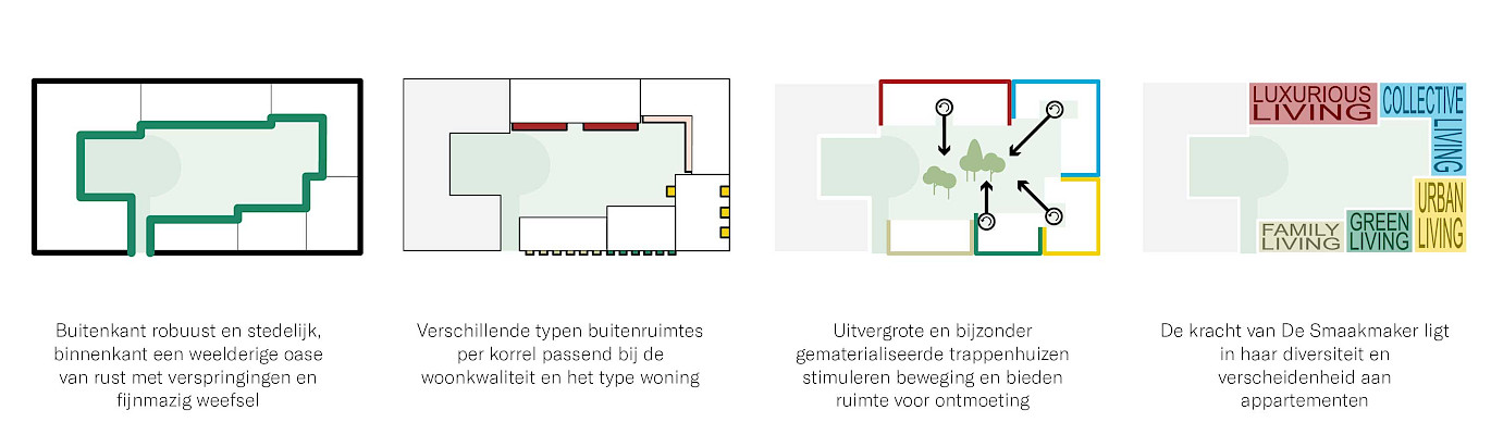 De kracht van de Smaakmakers ligt in haar diversiteit, bestaande uit vijf aansprekende circulaire karakters met een sterk eigen identiteit voortbordurende op het industriële verleden van de plek. Een variatie van vijf diverse gebouwen met elk hun eigen aansprekende karakter, woontypologie, ontsluiting, architectuur en materialiteit. De blokken zijn verschillend qua sfeer door het gebruik van onderscheidende steenachtige materialen. Tegelijkertijd is er eenheid en samenhang door het hoofdthema: industriële ornamentiek. De industriële ornamentiek, de aardse, stenige materialen en een fris palet van kleuren zijn de verbindende elementen.