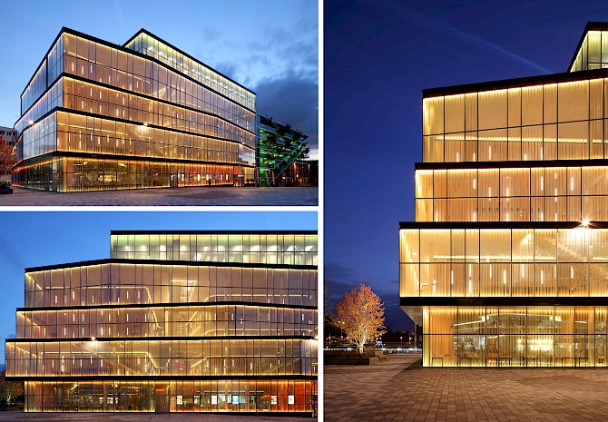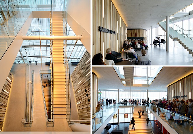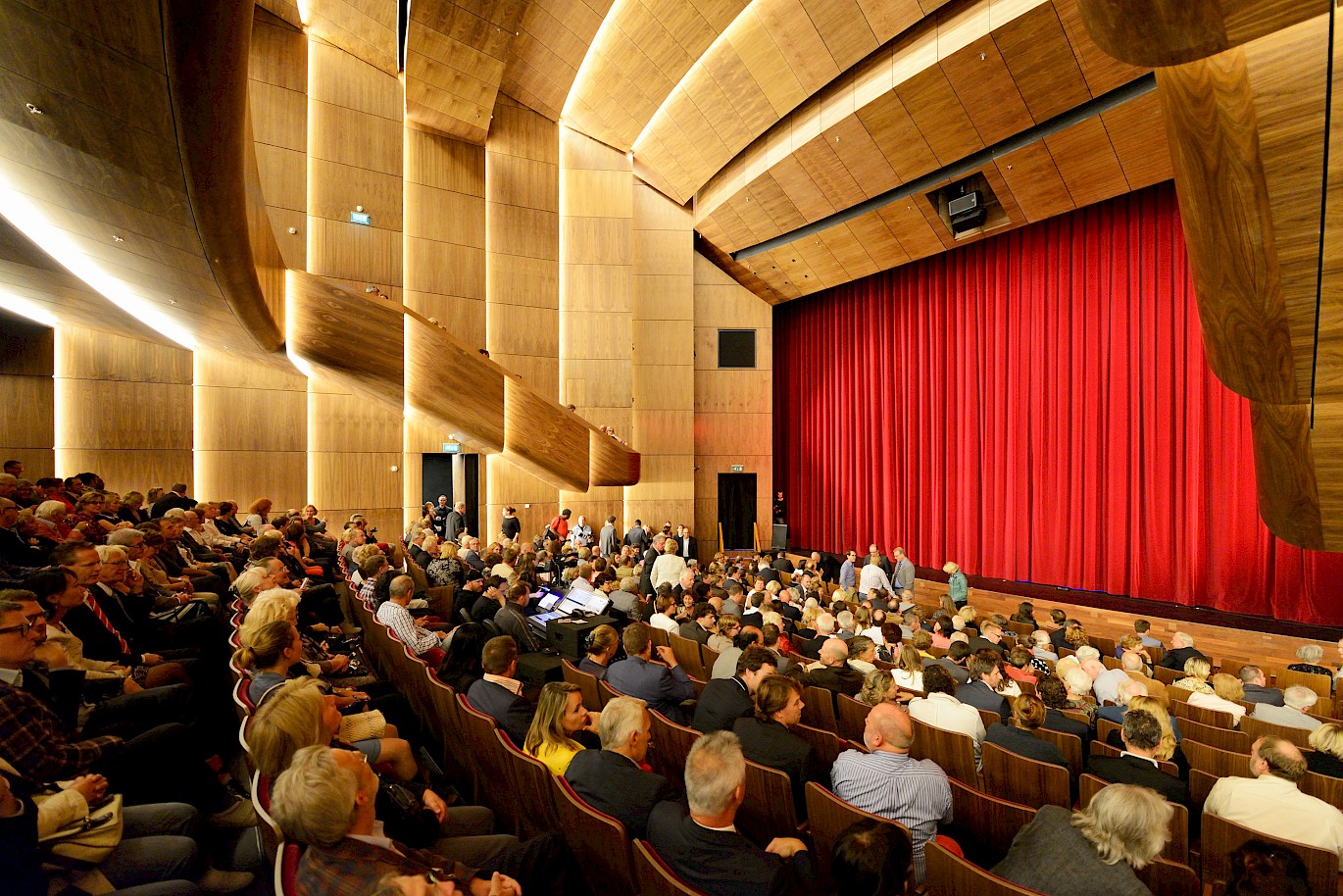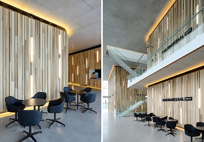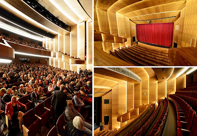 Het nieuwe theater bestaat uit twee zalen: een grote zaal met balkon met 650 à 700 stoelen en een kleine vlakke vloerzaal met balkon met 200 stoelen. Drie spectaculaire foyers en een theatercafé met uitzicht op het Stadsplein maken het geheel compleet. Bovenop het theater is het kunstencentrum gesitueerd, met een aantal muziek-, dans-, en theateropleidingen. De glazen gevel is bedrukt met een print die een illusie van (theater)gordijnen wekt. Deze print werkt als zonwering en voorkomt daardoor oververhitting door de zon. Terwijl aan het stadsplein, waar de foyers en de meeste mensen zijn, de translucentie de uitwisseling van beelden en silhouetten van binnen naar buiten stimuleert en andersom. Wie over het stadsplein loopt, ziet het uitgaanspubliek in een ruim twintig meter hoge ‘etalage’ die ‘s avonds wordt verlicht met in verschillende kleuren af te stellen energiezuinige led-verlichting.